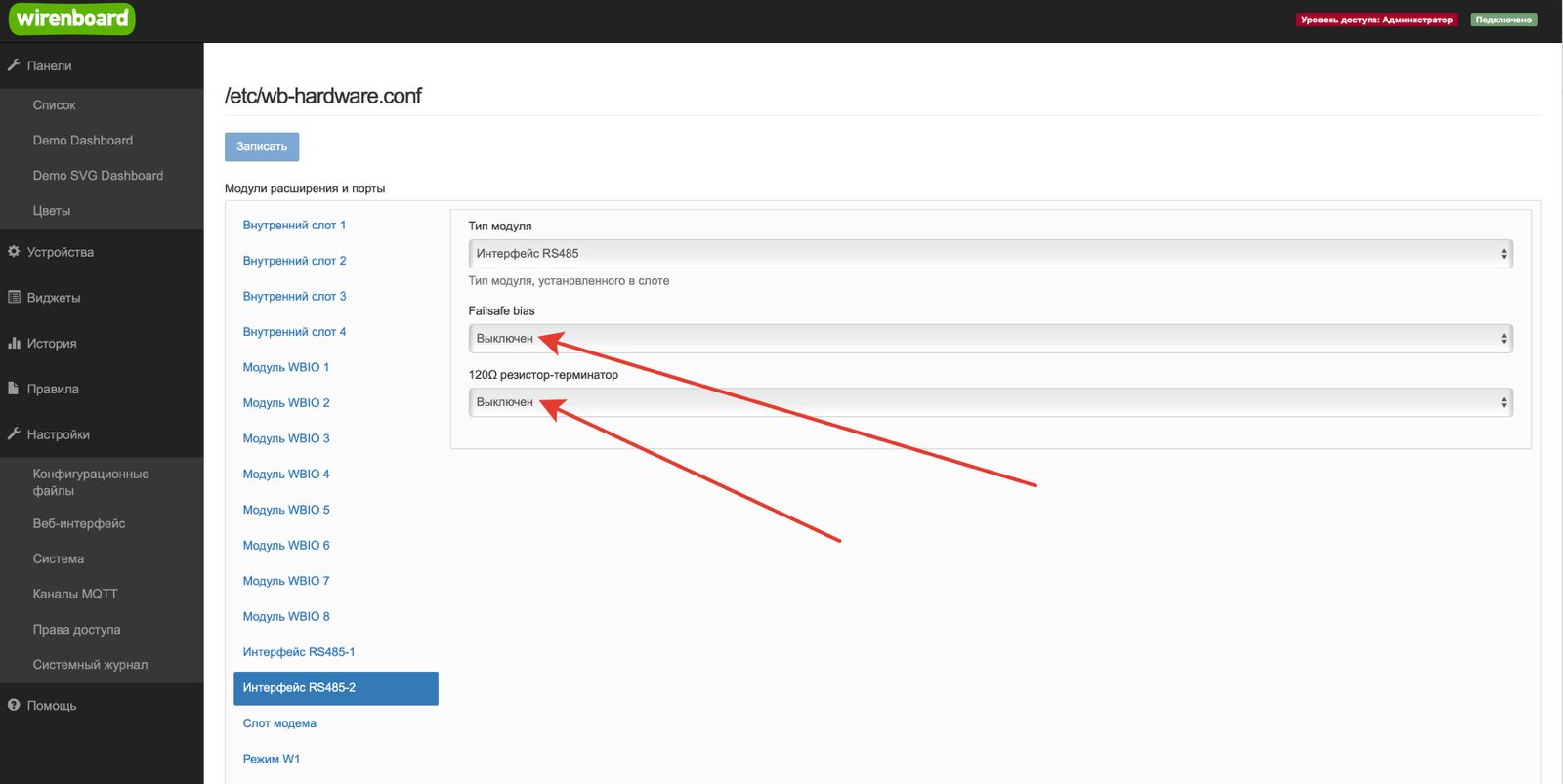 Пробовал на разных портах контроллера, в том числе и MOD1 через WBE2-I-RS485.