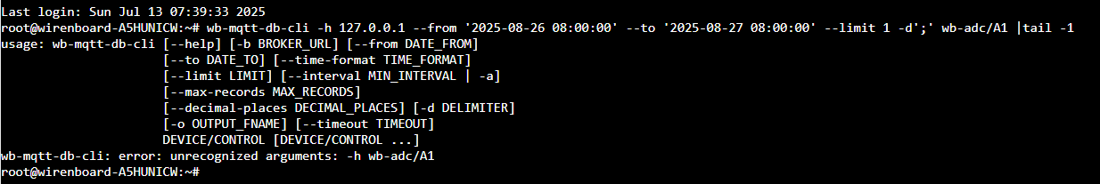2025-08-27 11:50:32cmd Erroroutput: usage: wb-mqtt-db-cli [–help] [-b BROKER_URL] [–from DATE_FROM]