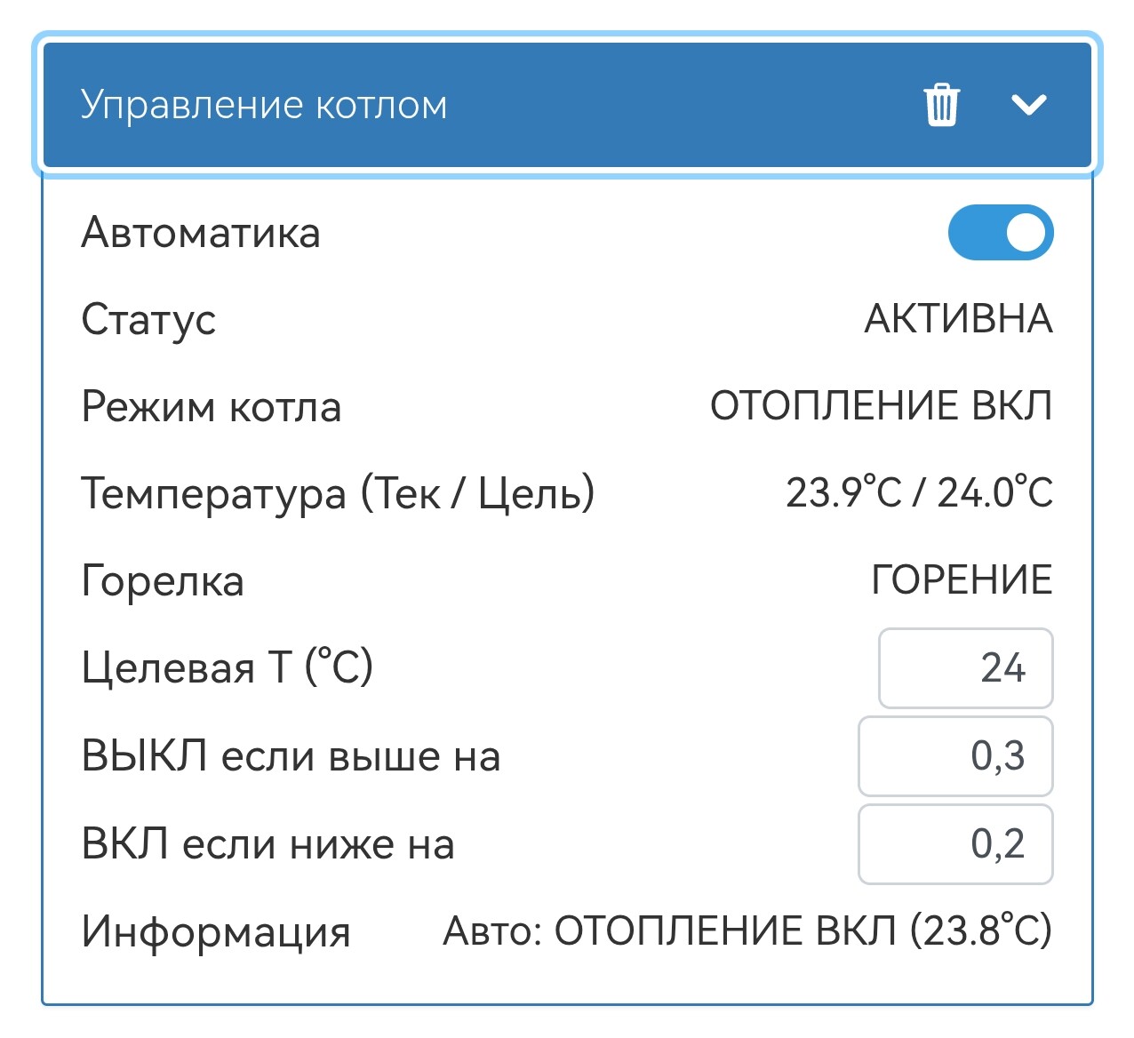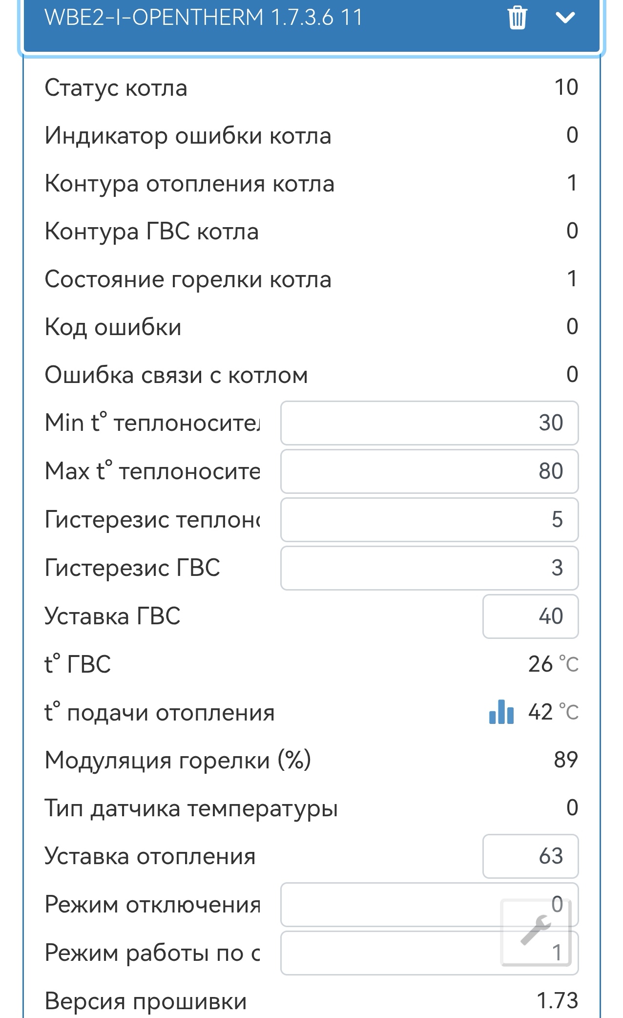 И поля управления котлом (wbe2-i-opentherm_11/Season reg) и статус горелки (wbe2-i-opentherm_11/Boiler Flame Status).