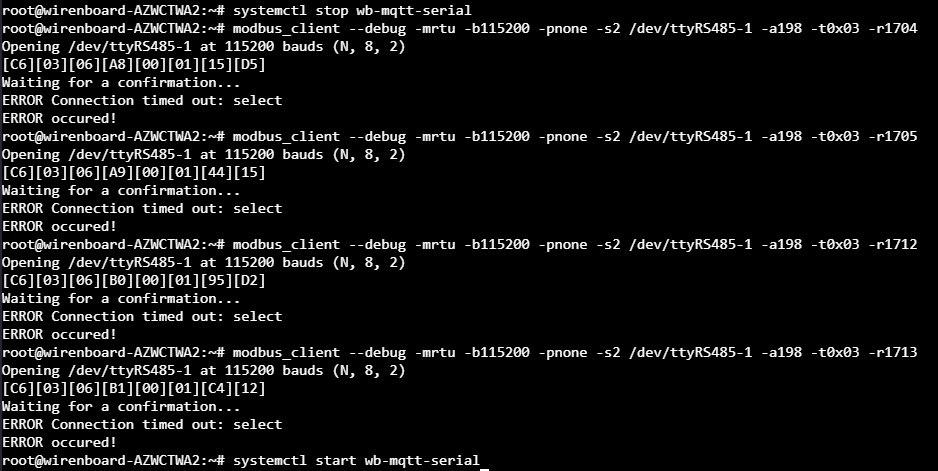 А опрашивается ли модуль с помощью wb-mqtt-serial? То есть я такого еще не ввидел - чтобы он удачно опрашивался из сервиса но неудачно при использовании modbus_client.