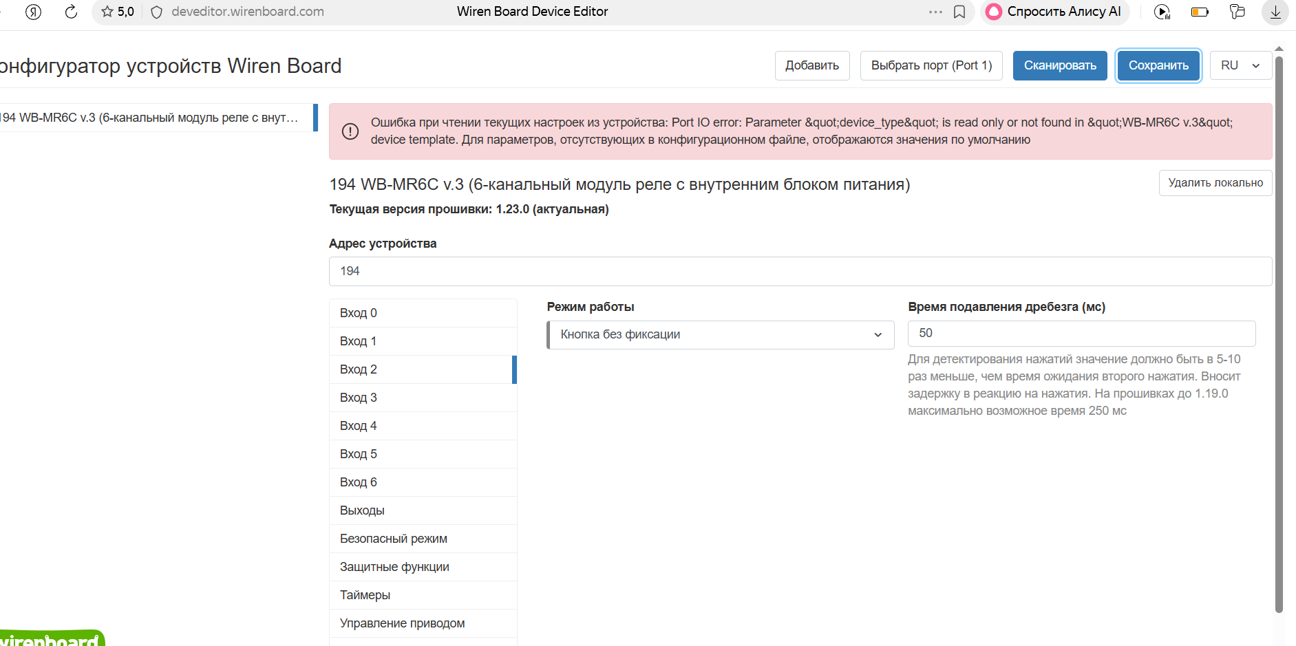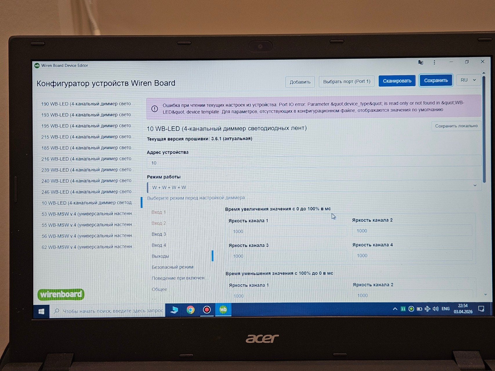 У меня такая-же проблема. Хотел отключить в настройках диммера WB-LED плавное включение (диммирование при включении) но выдает ошибку при попытке изменить какие-либо настройки