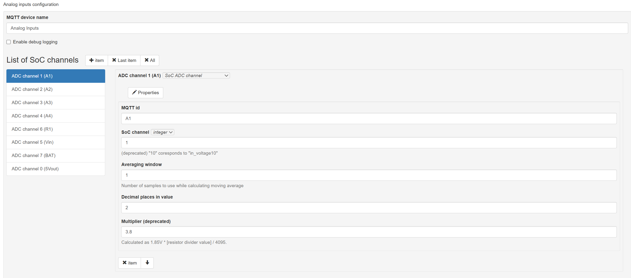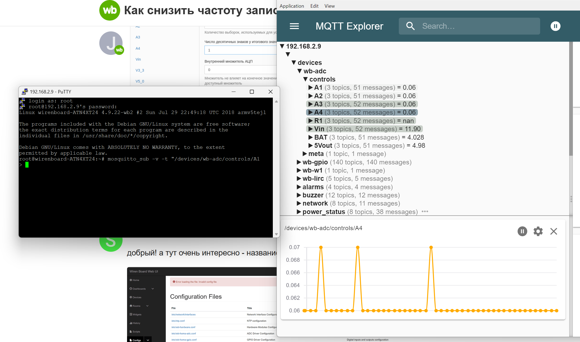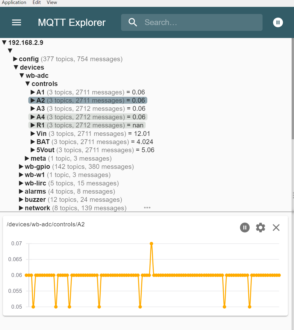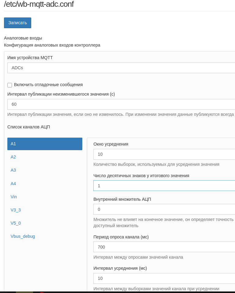 А если ппосмотреть на контроллере командой mosquitto_sub -v -t "/devices/wb-adc/controls/A1" – тоже будут сыпаться одинаковые значения?