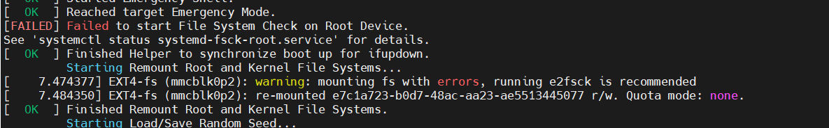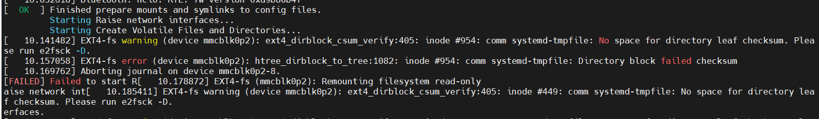 [ 8.034344] EXT4-fs (mmcblk0p2): warning: mounting fs with errors, running e2fsck is recommended