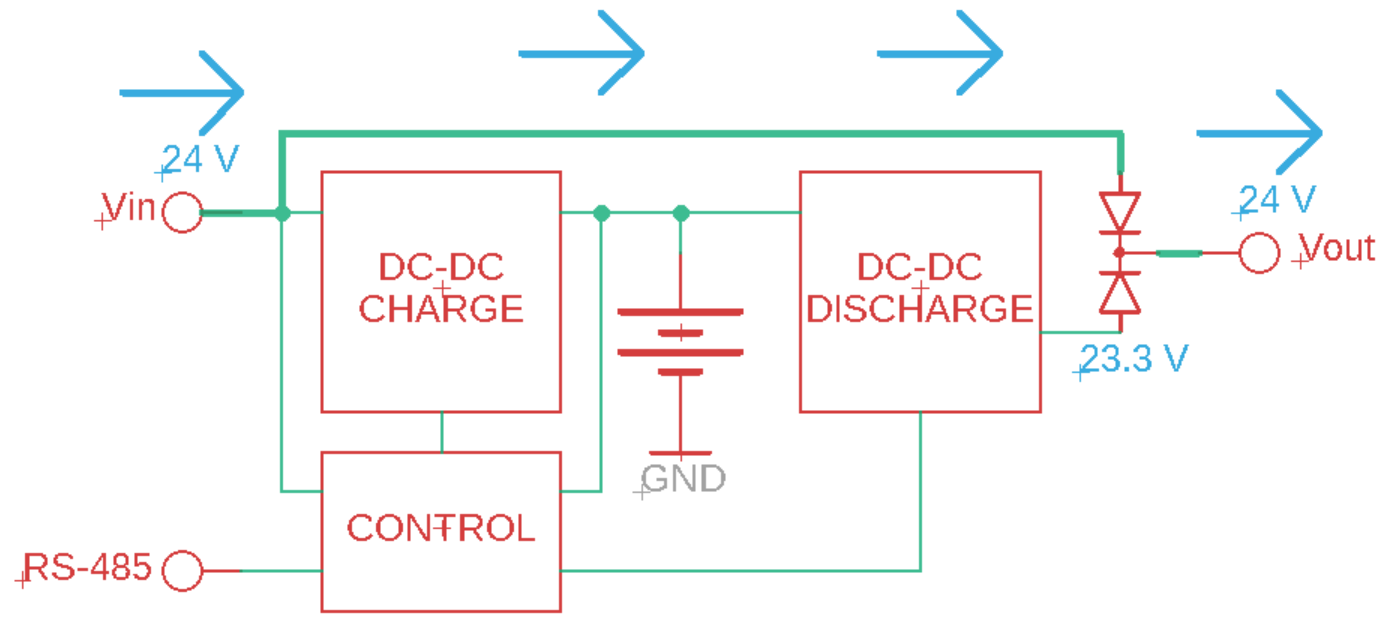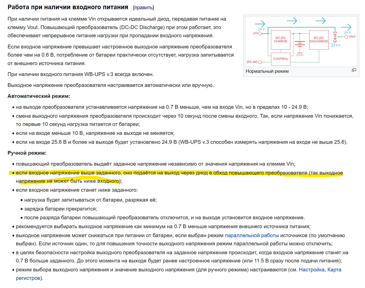 Исключением является ручной режим и случай, когда входное напряжение ниже установленного выходного. Тогда поддержание заданного значения напряжения обеспечивает аккумулятор и происходит разрядка.