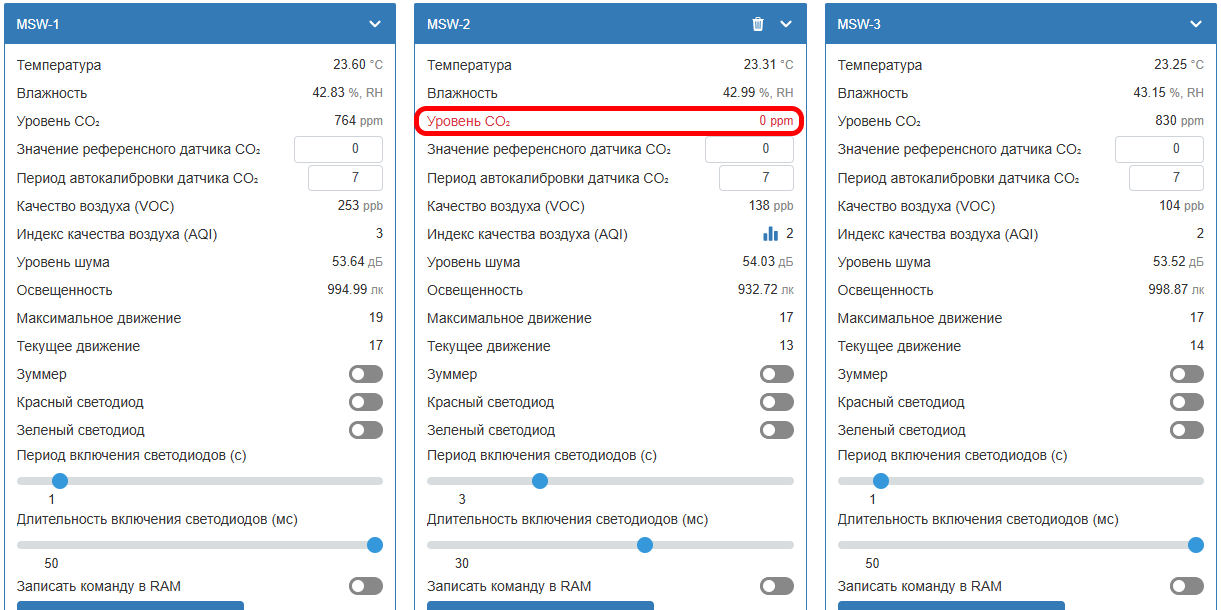 Пару месяцев назад приобрели пару датчиков WB-MSW v.4. При подключении и настройке обнаружил, что на одном из них (он второй по счету, поэтому назван MSW-2) не показываются показания CO2.