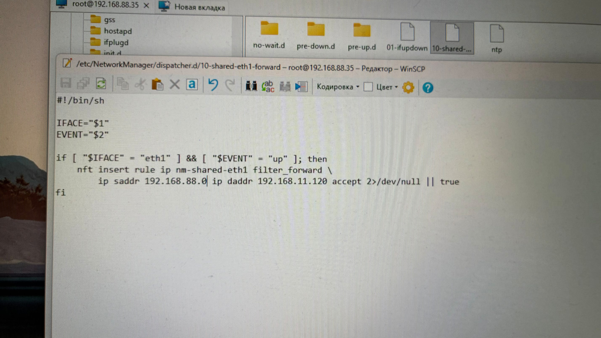 На контроллере нужно создать (через командную строку) файл/etc/NetworkManager/dispatcher.d/10-shared-eth1-forwardсо следующим содержимым: