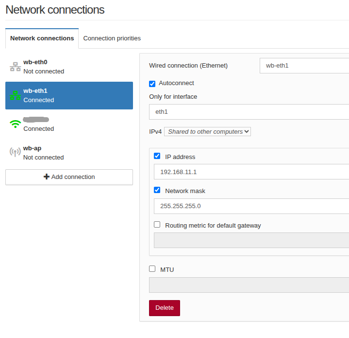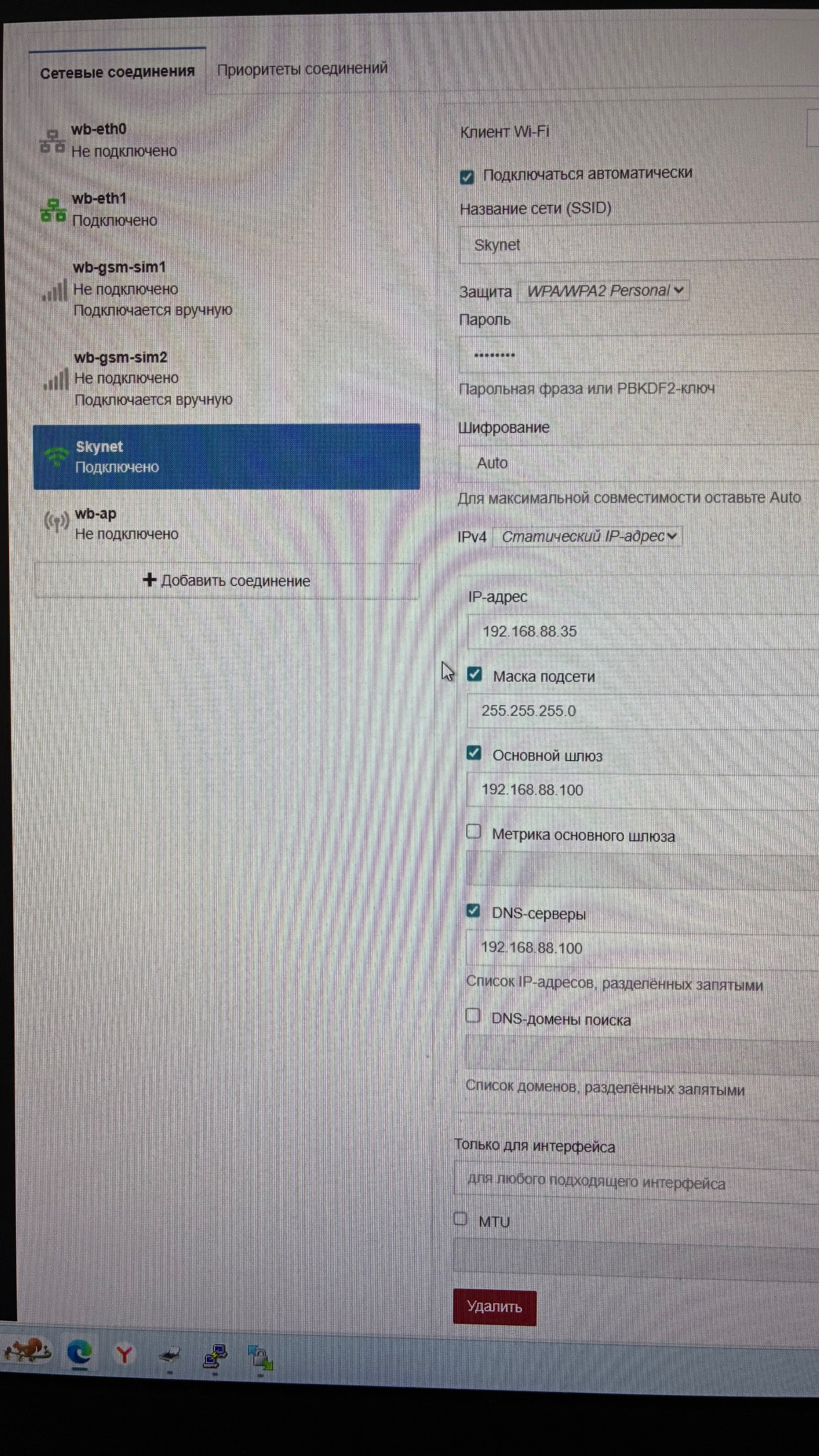 + Add connection(с фиксированным адресом192.168.88.35вне диапазона, который раздаётся по DHCP в Wi-Fi сети):