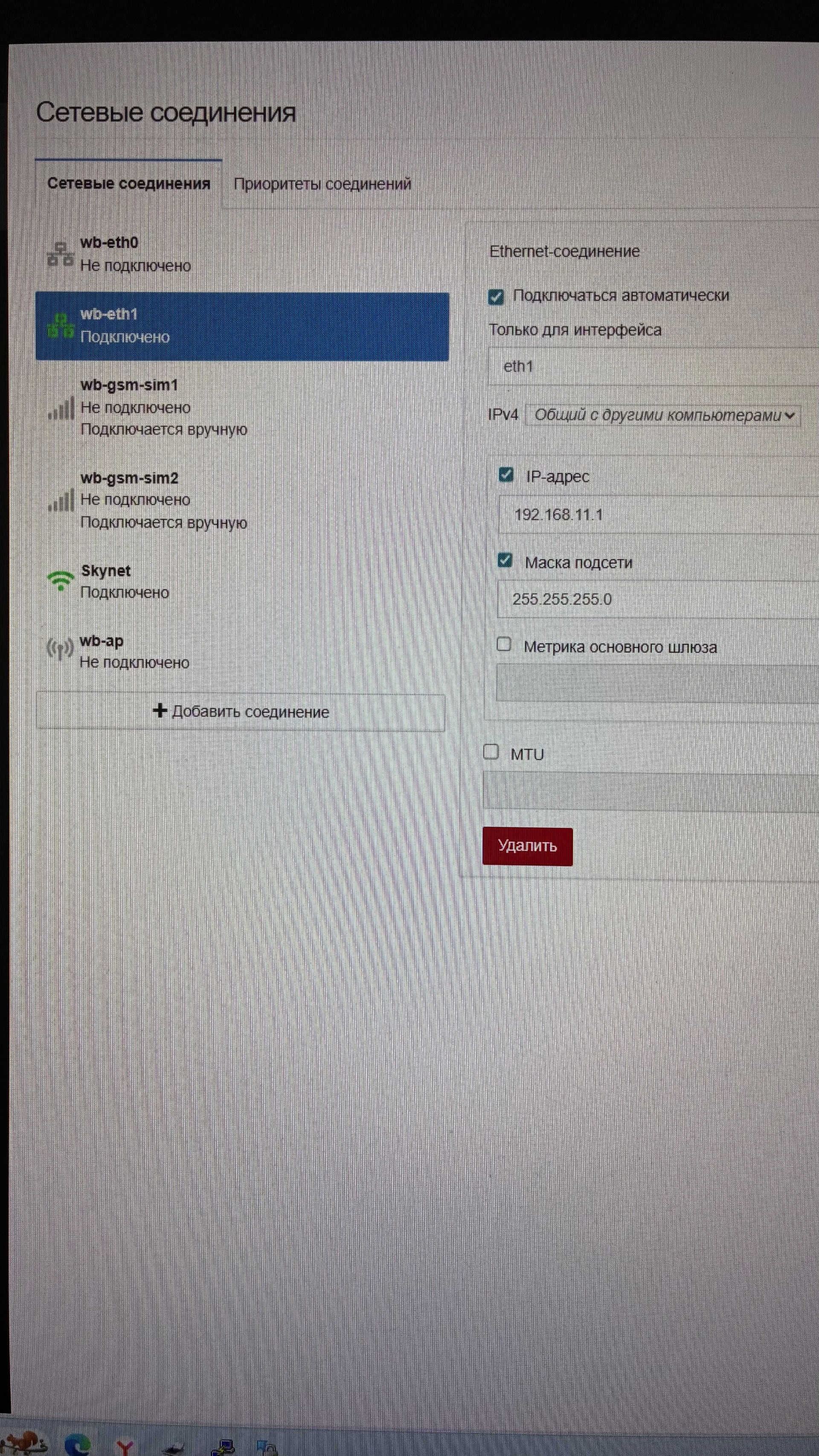 eth1в режиме раздачи интернета («Shared to other computers»):