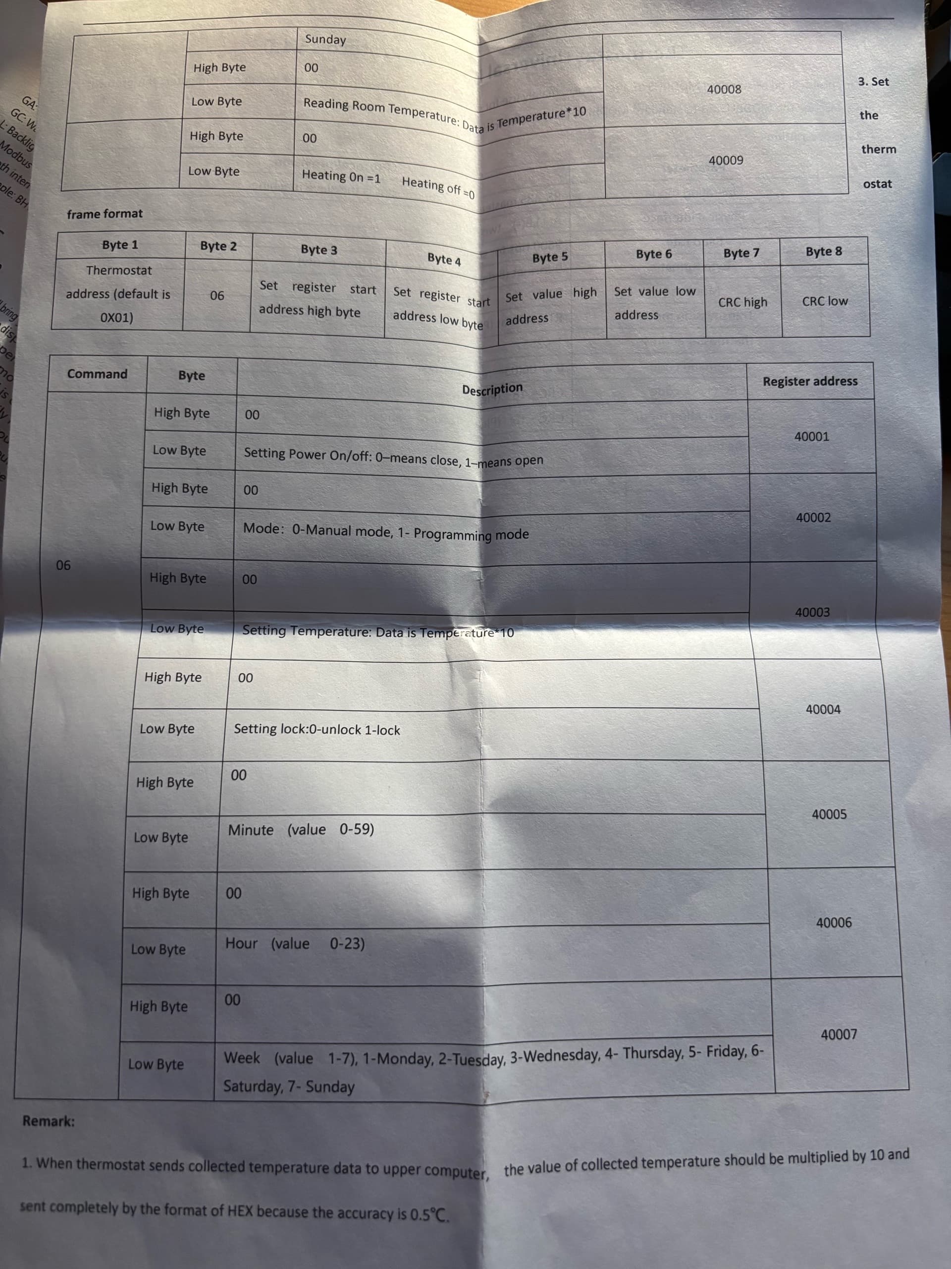 Да, действительно, карта регистров от производителя не соответствует реальным параметрам термостата, данные были получены экспериментальным путём. В общем, удалось получить обратную связь путём выключения параметра Failsafe bias в настройках шины RS485. Хотелось бы понять чем это чревато, если оставить как есть