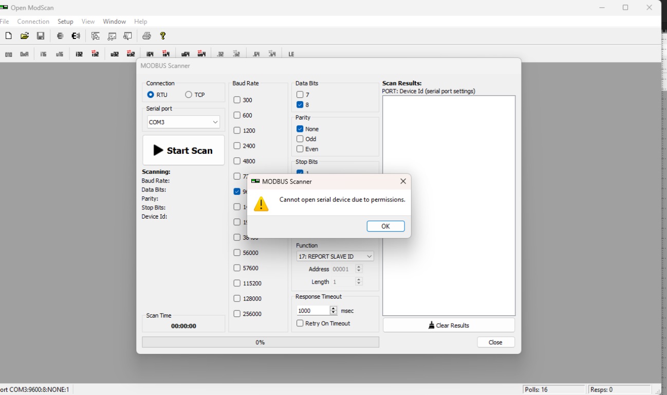 Приобрел устройство WB-USB485 (конвертор). При старте сканирования выдает такую ошибку. COM порт выставлен правильно, дрова на CH343SER переустановлены. Порты менял. Пробовал на win7 и на win11 разницы нет. Хотя программа другой стик-конвертор видит. Заводской брак?