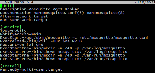 Настройки /etc/mosquitto/mosquitto.conf и /lib/systemd/system/mosquitto.service следующие: