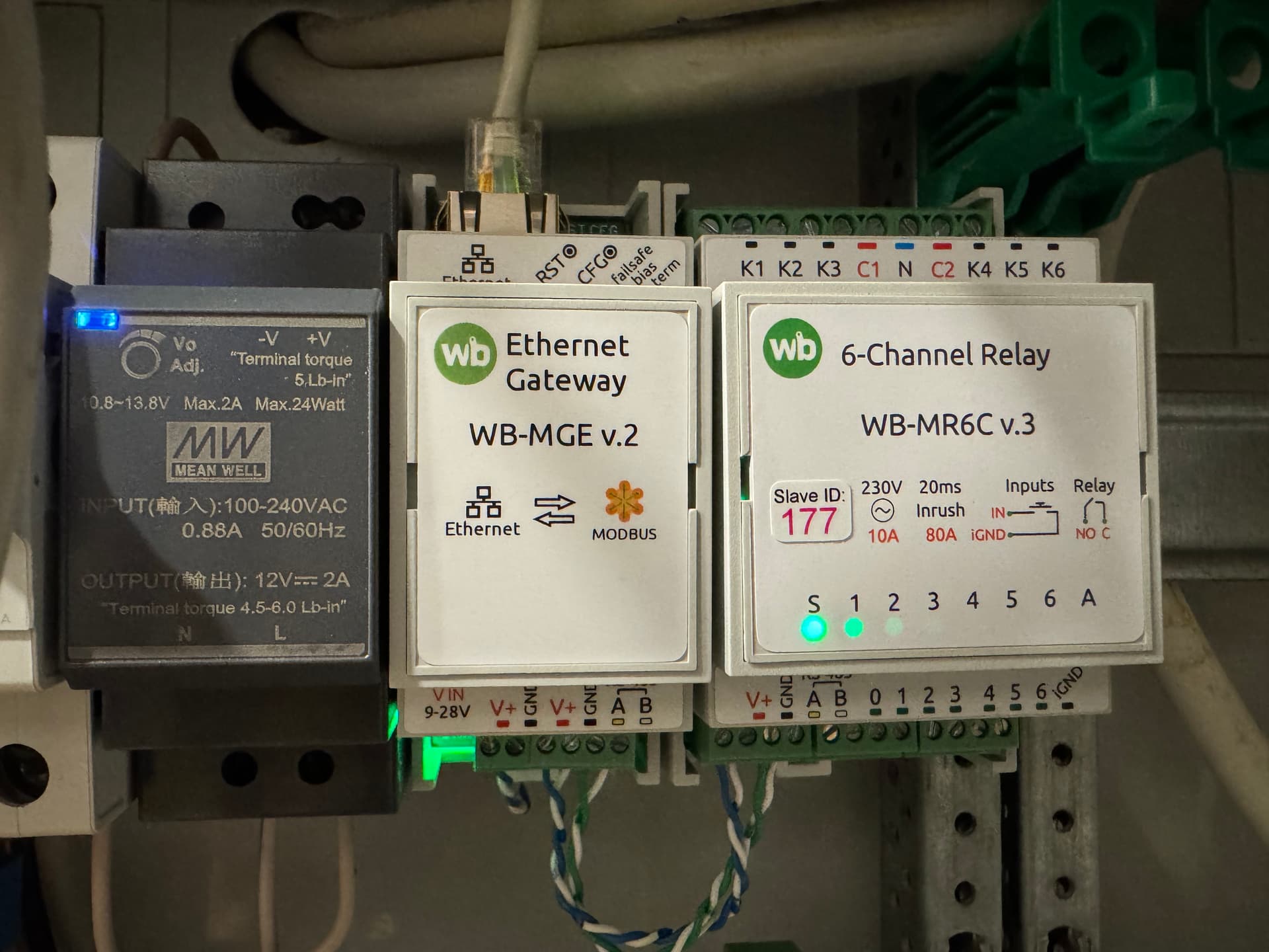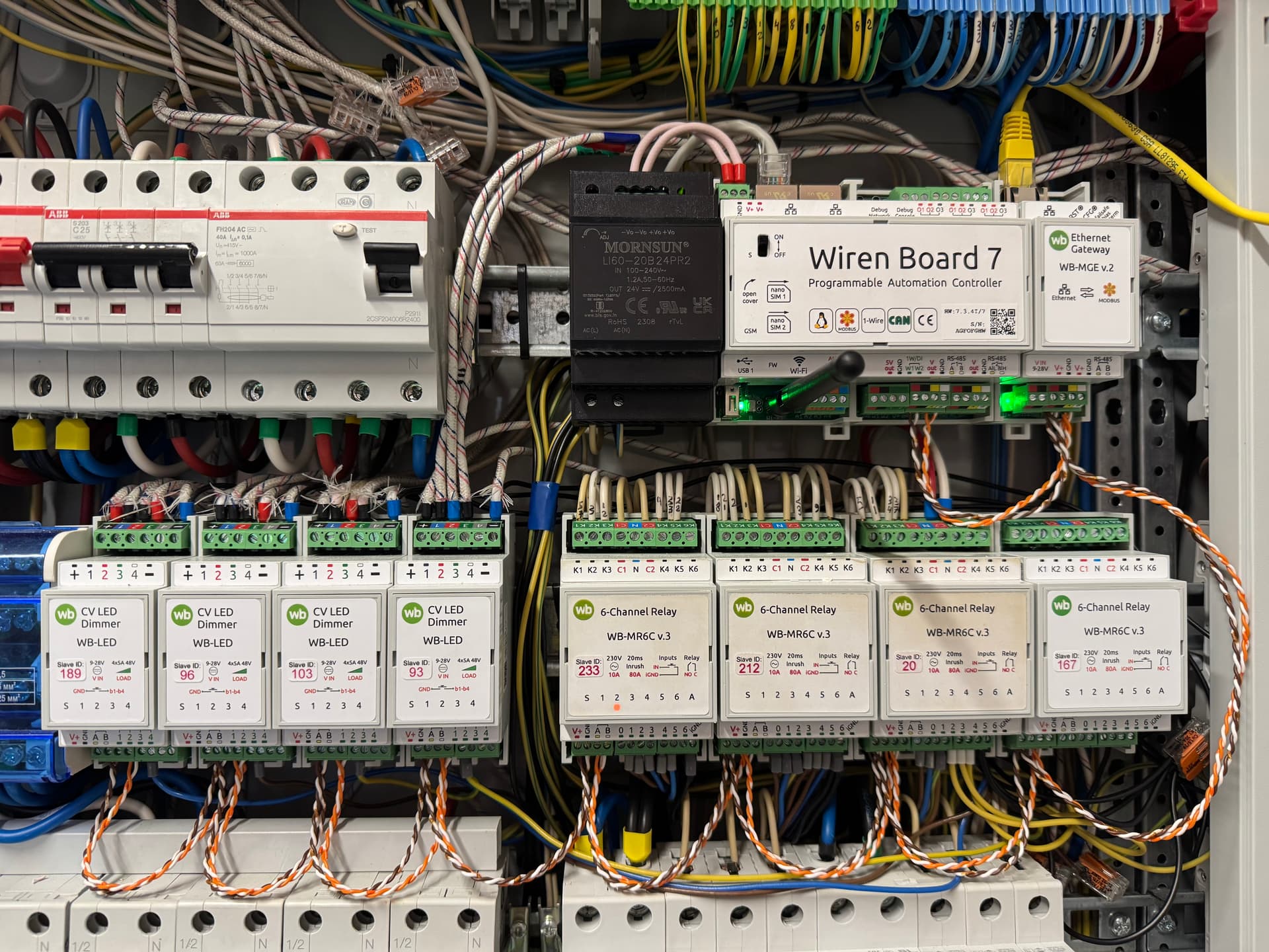 У меня стабильно работала слудующая связка устройств от WB как на фото ниже, но без WB-MGE v.2 и WB-MR6C v.3 №167 (в рамках отдельного строения “Баня”)