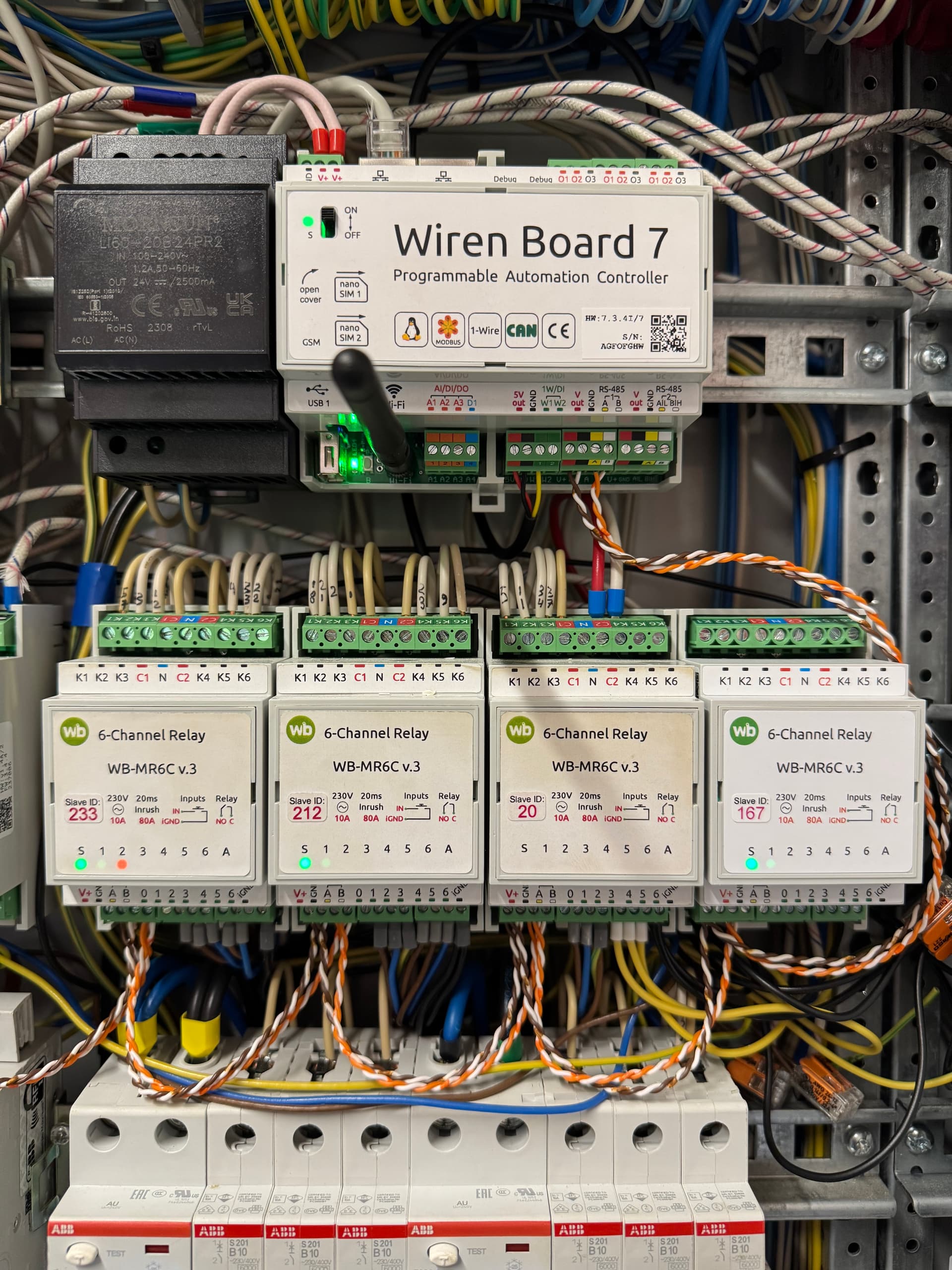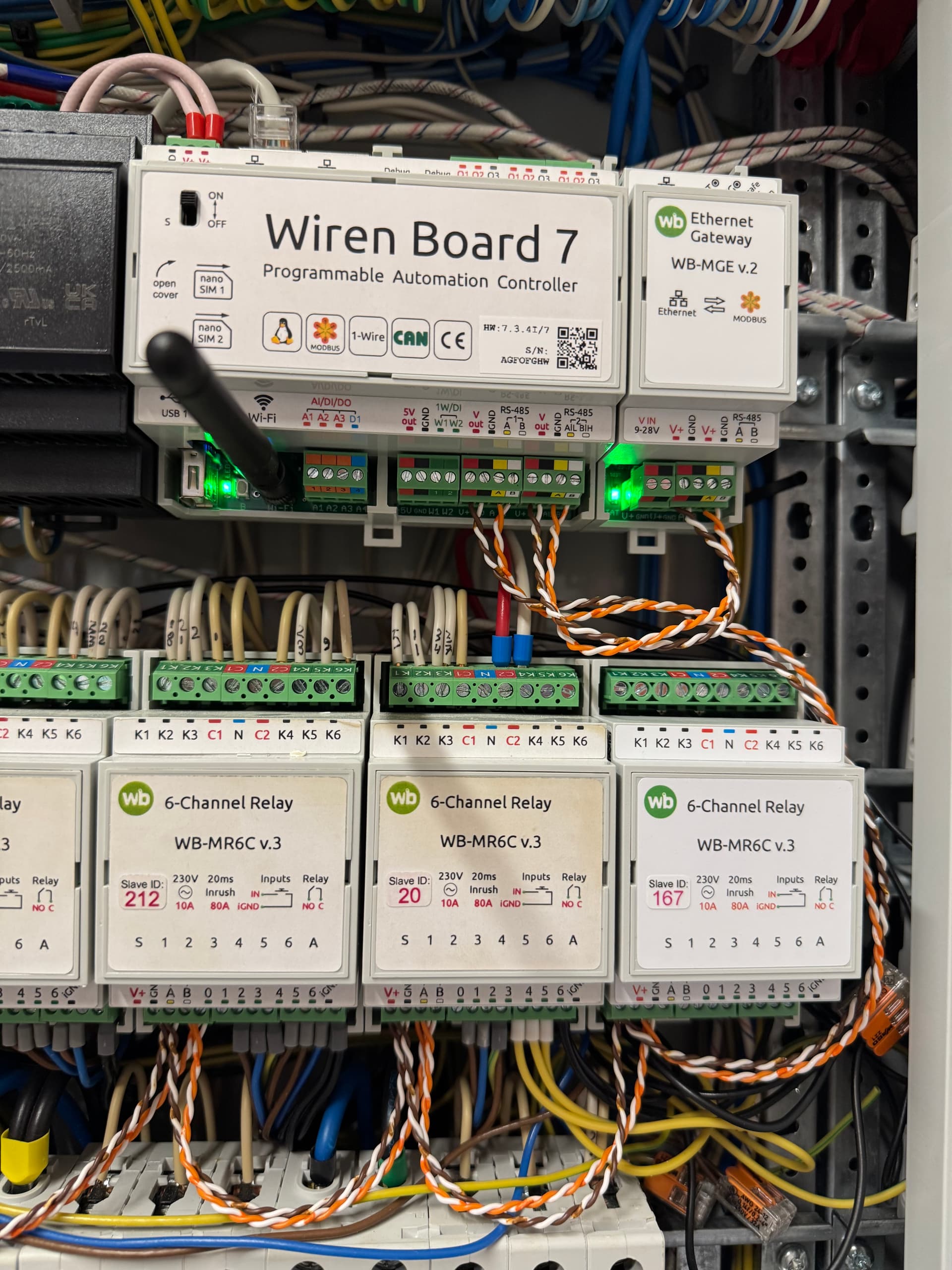 Пытаясь исключить разные ситуации (была гипотеза что просто WB-MGR v.2 в доме не рабочий или WB-MR6C v.3 №167 не рабочее) я поменял местами WB-MR6C v.3 №167 и №177 (как сейчас на фото). После чего устройство WB-MR6C v.3 №167 сразу же определилось контроллером и привязалось и при этом устройство WB-MR6C v.3 №177 так же продолжило работать. Реле переключаются с контроллера и казалось бы все отлично.