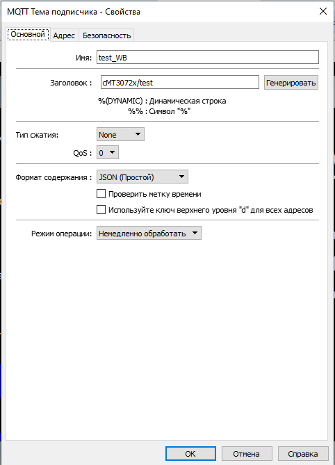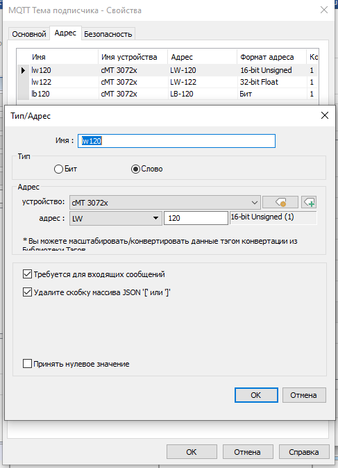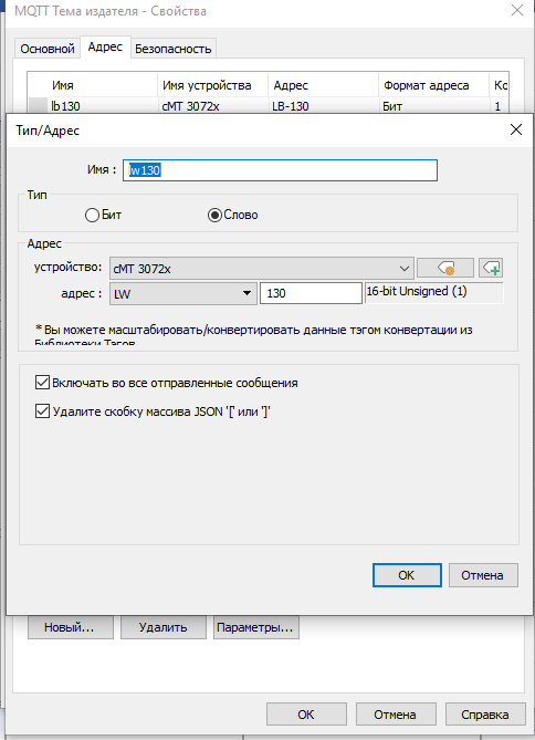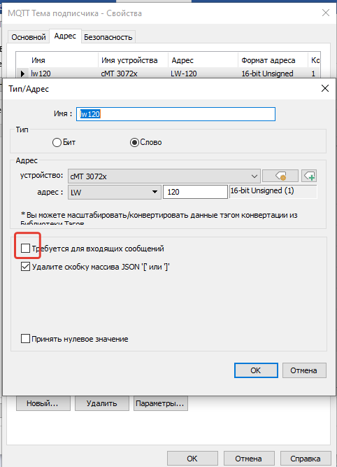 со стороны weintek настройки как публиковал ранее, за исключением одной галочки выше. Адреса и имена регистров в подписке и публикации mqtt у weintek должны совпадать. Есть ньюанс, при загрузке weintek публикует значение ячеек памяти. Если необходимо энергонезависимые данные, то их надо хранить в RW регистрах у weintek.Иниче при загрузке weintek в WB опубликуются нули.