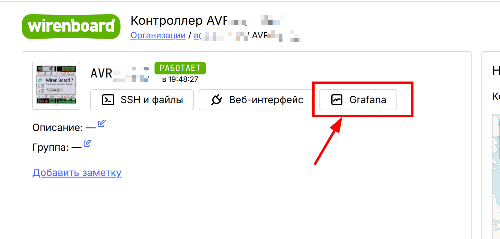 Похоже, речь про контроллер Wiren Board (у вас на скрине WB7), подключённый к Wiren Board Cloud, и кнопку Grafana в карточке контроллера.