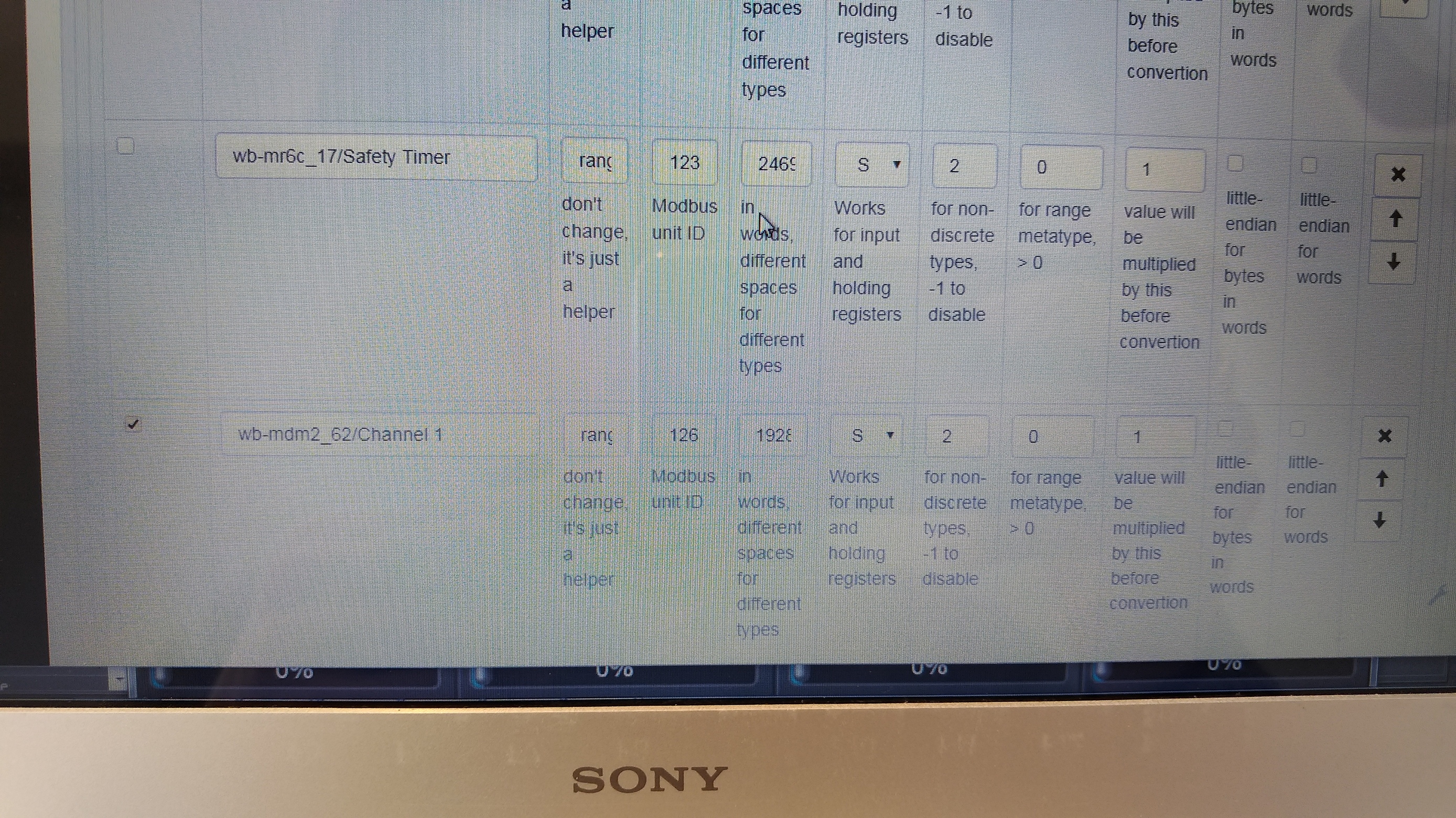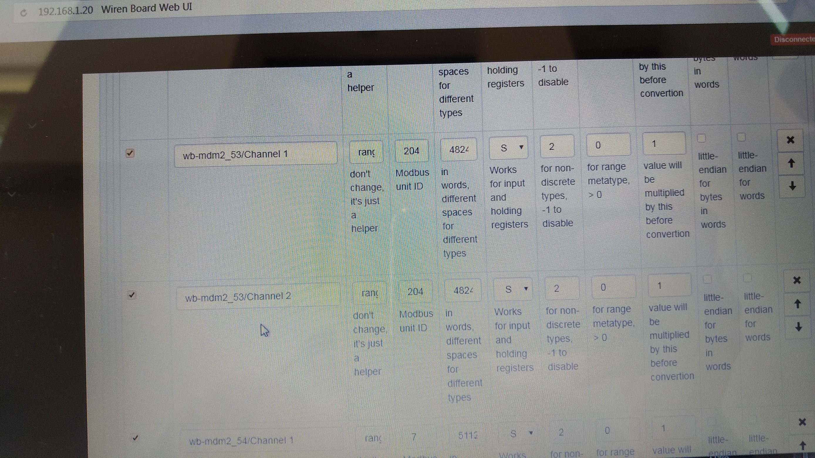 Простите, но на скриншотах у вас показан интерфейс modbus-gateway. Modbus-устройства к контроллеру подключаются через wb-mqtt-serial (Serial Device Driver Configuration). Пожалуйста, опишите подробнее схему подключения и решаемую задачу.
