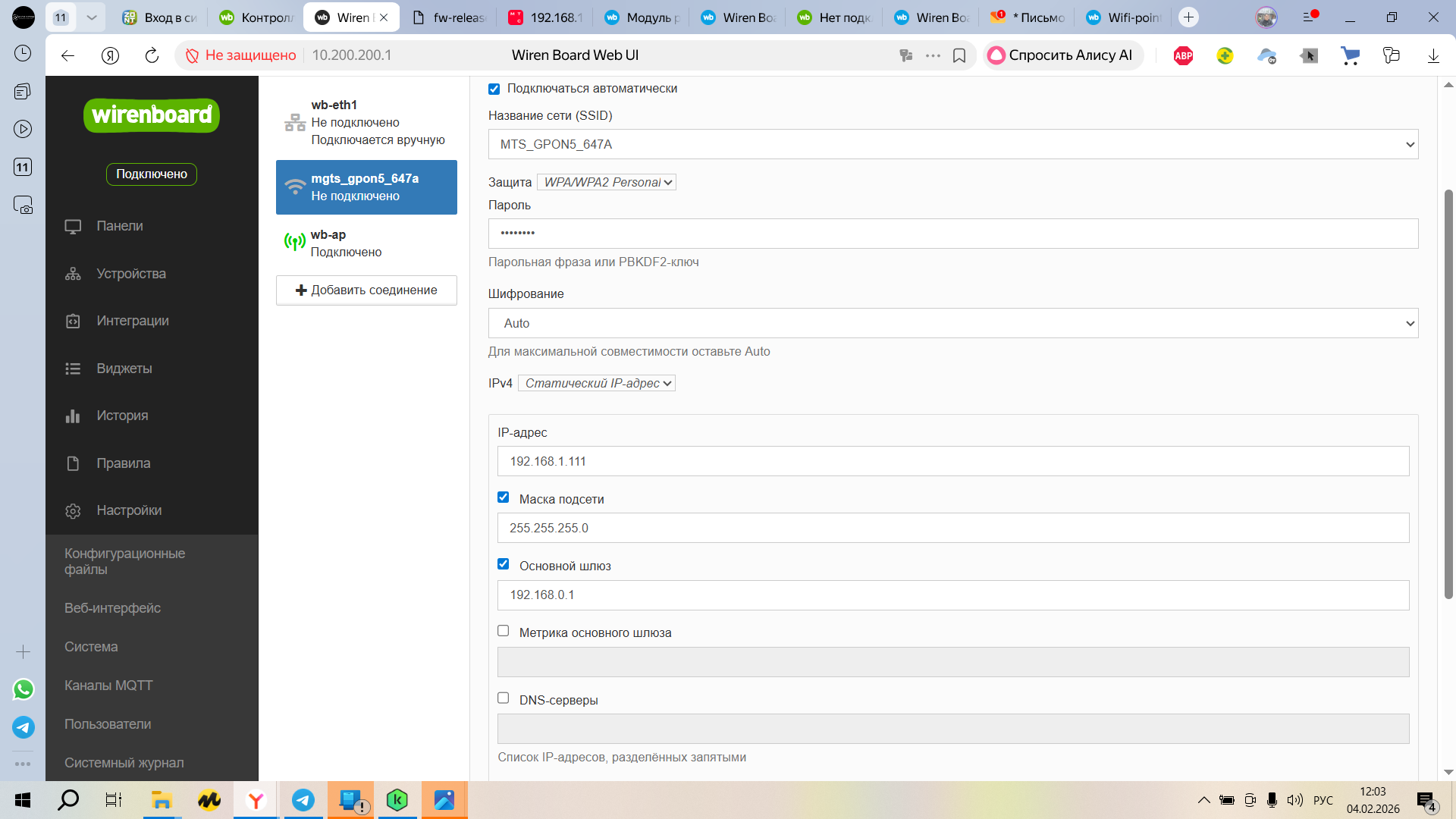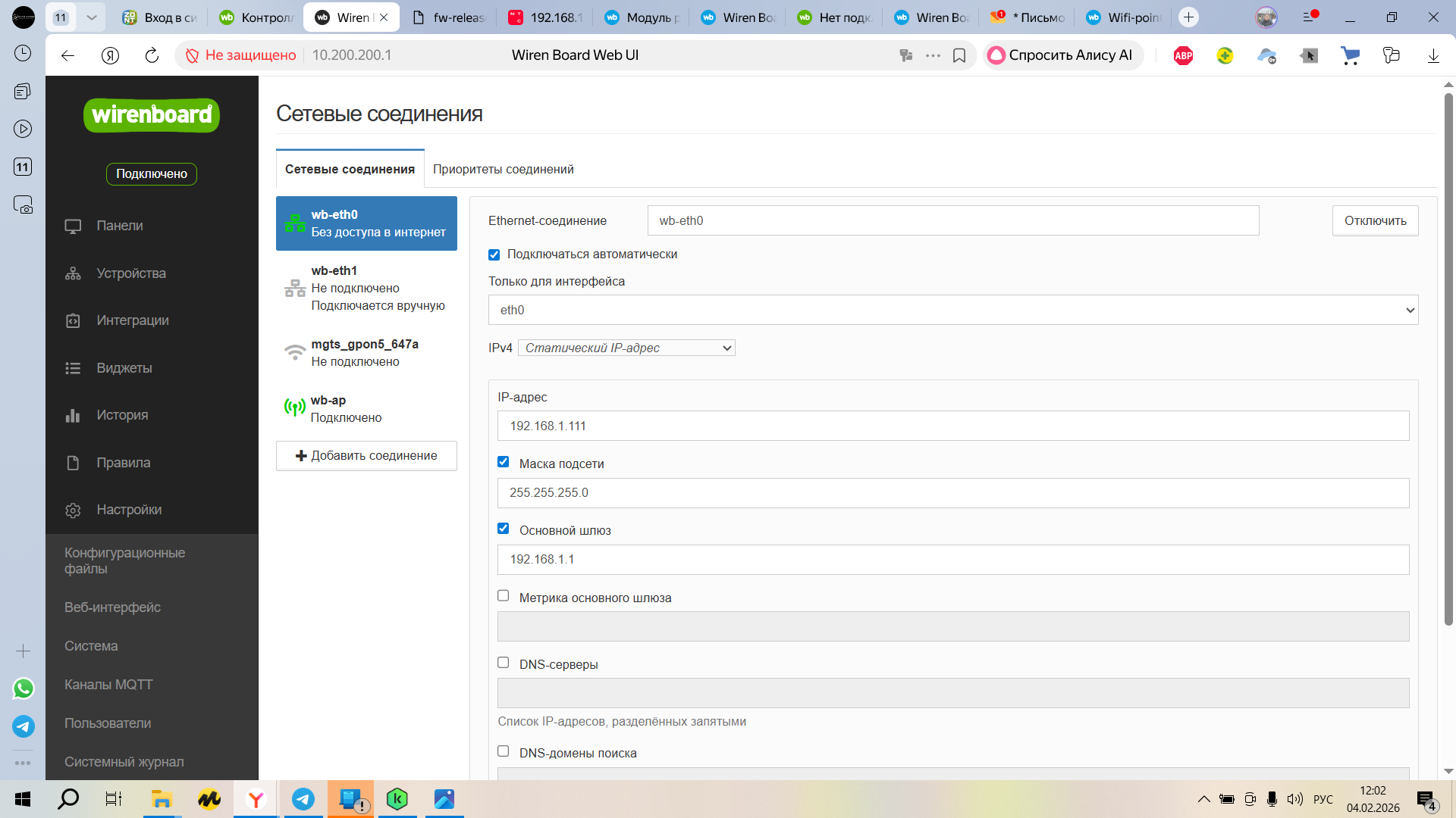 Рекомендую настроить соединение по инструкции: Настройка сети в контроллере Wiren Board