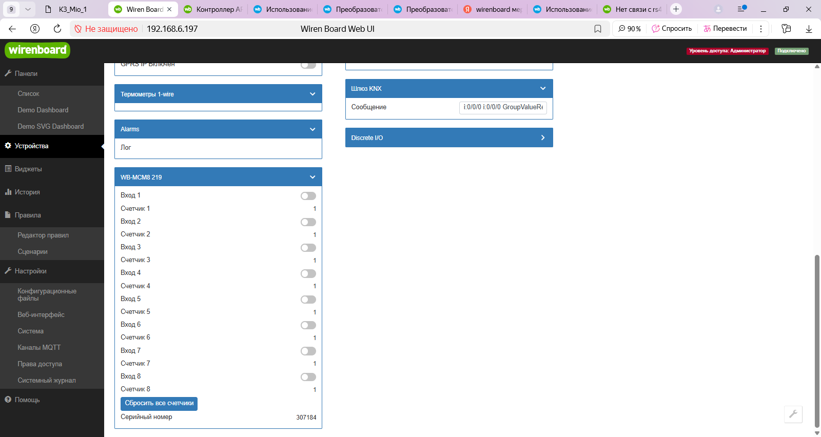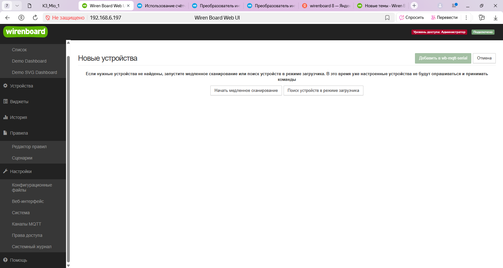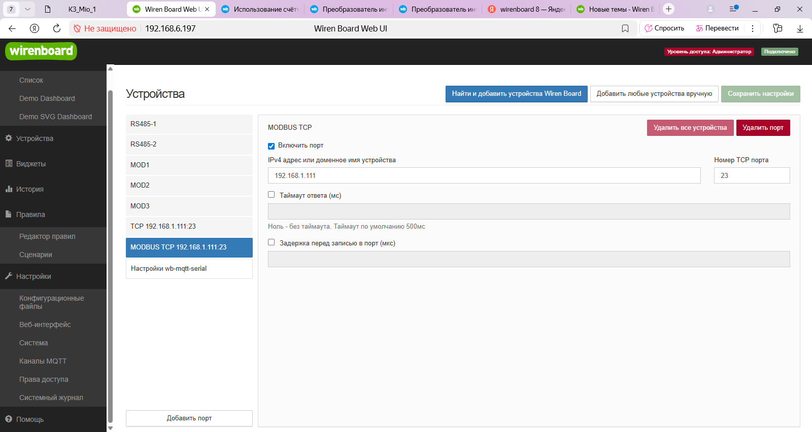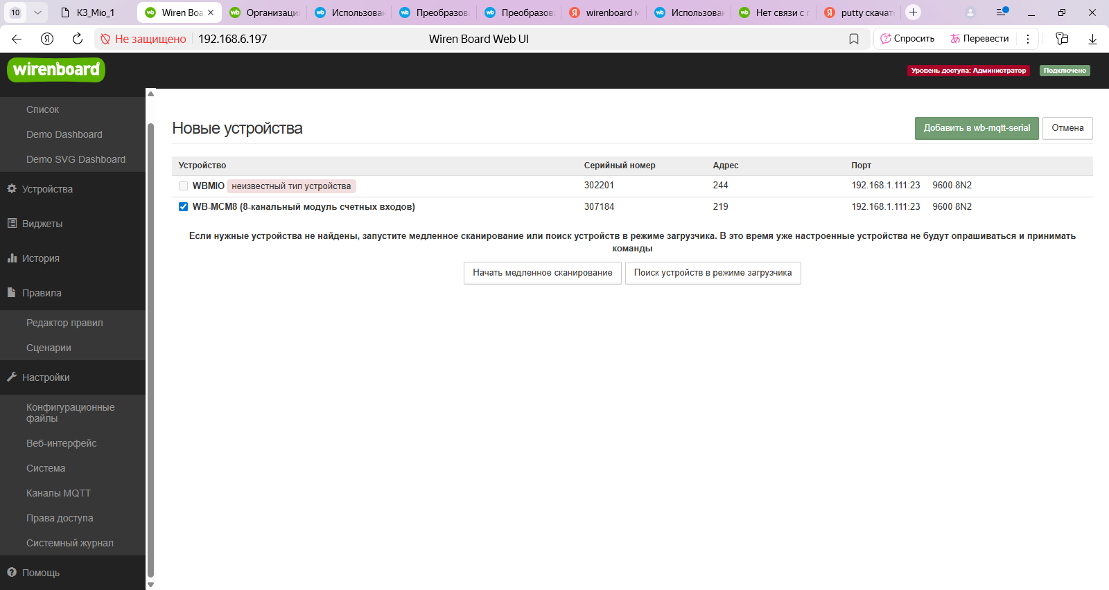 Добрый день. Имеется ethernet между двумя зданиями. в Одном контроллер 8.5 192.168.6.197, в другом Wb Mio v2 192.168.1.111. (в одной сети ругается поиск устройств, no route to host в логе). Роутер микротики hex s. К мио по rs подключен MCM8 и далее по шине счетчик Меркурий 234, на конце терминатор.