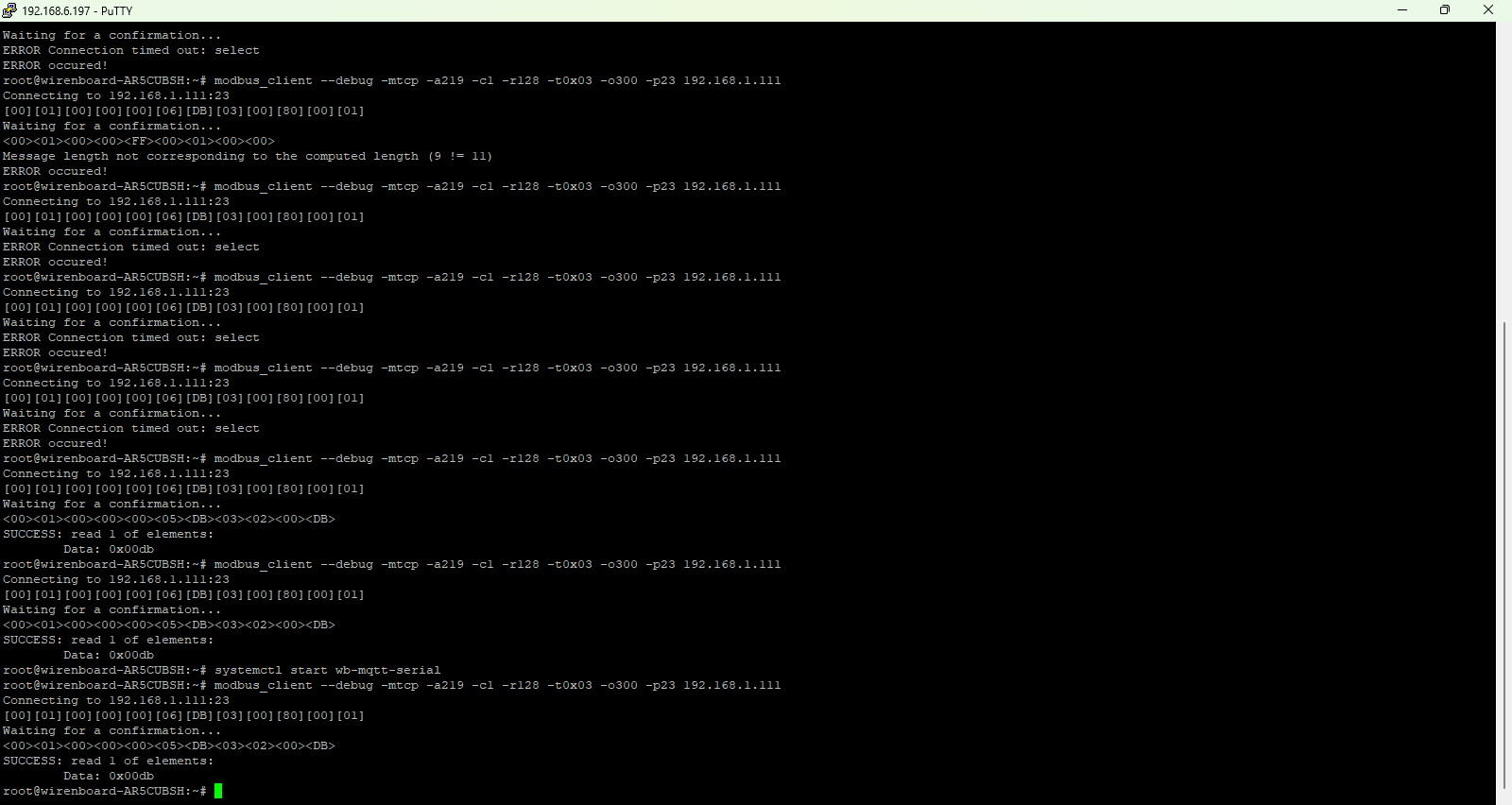 Алексей, мы с вами общались по телефону. Прошу написать результат проверки связи через modbus_client с WB-MCM8 (219).