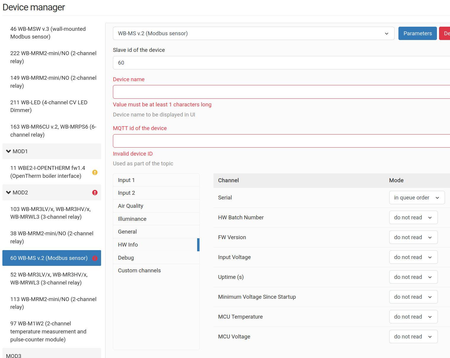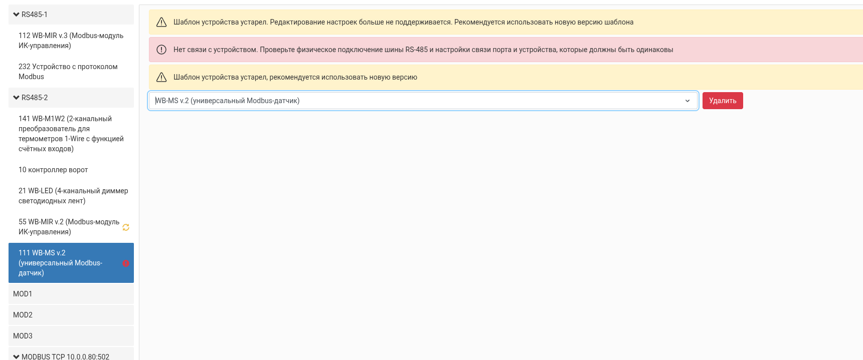 Здесь в выпадающем списке если вместо WB-MS v.2 (Modbus Sensor) я выбираю WB-MS v.2 (Modbus Sensor) (вы не ошиблись, просто выбираю тоже самое) - и там все мои настройки исчезнуты. Например, я точно помню, что настраивал Devica name, MQTT id of the device, MCU Voltage, но этго ничего нет