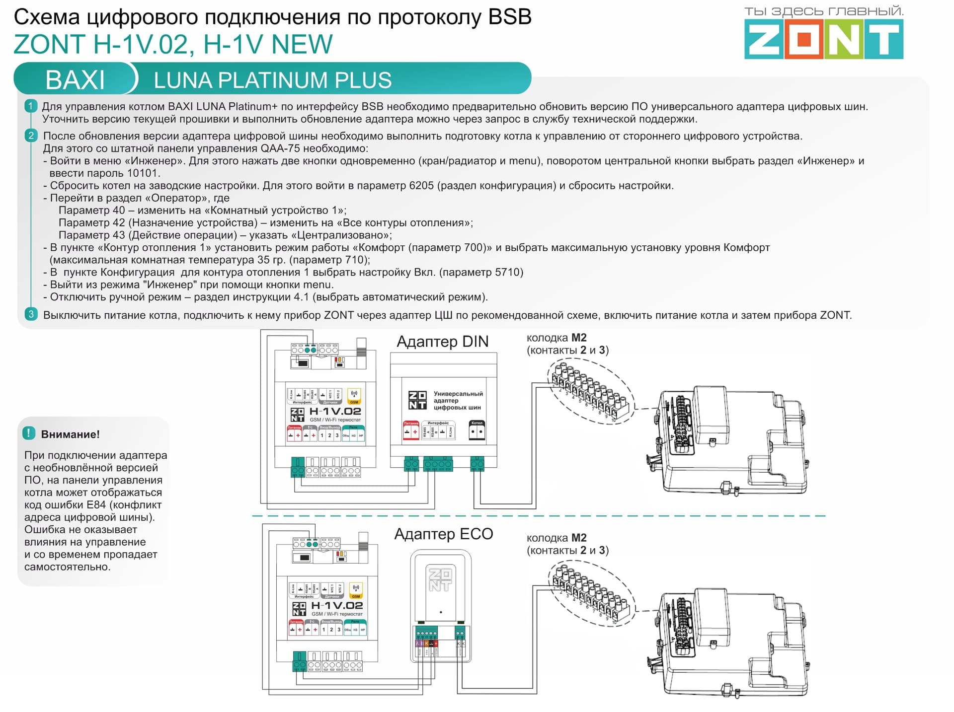 Также обращаю внимание, что на рынке существует решение от компании Zont для подключения Baxi LUNA Platinum+ по цифровому протоколу BSB. Это указывает на техническую возможность такой интеграции в принципе.