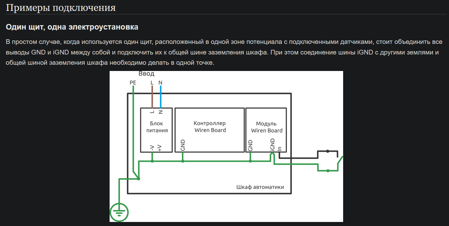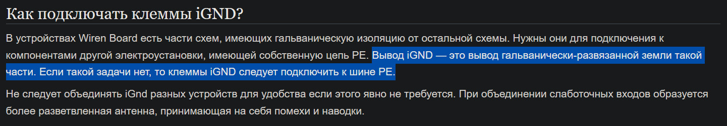 B все же до конца не понятно, на wiki “Заземление устройств Wiren Board и подключение контактов GND и iGND”, что если нет задачи гальванической развязки gnd и ignd, то стоит их объединить и соединить с pe: