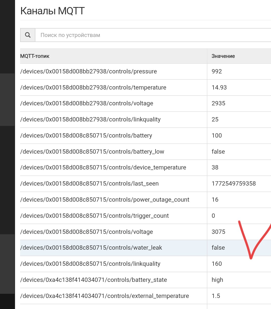 канал water_leak в статусе - false