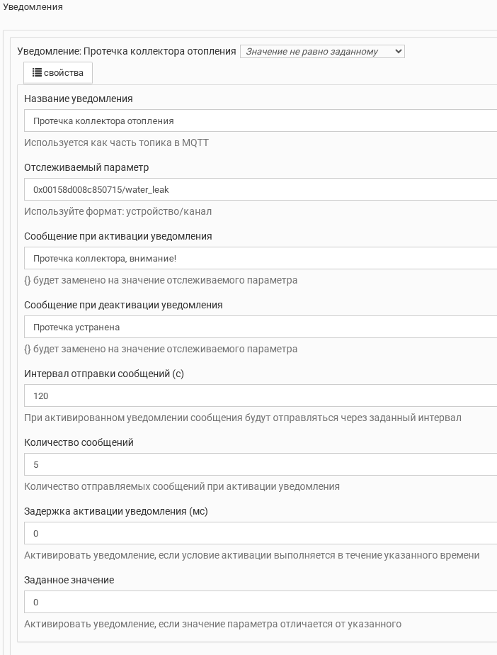 Выставленное значение в заданное значение - 0 (соответствие false) выдает постоянно оповещение о протечке в чат бот телеграмм.