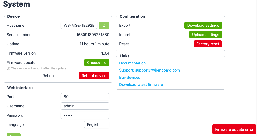 Не получается обновить прошивку через веб-интерфейс на MGE v.3. Через небольшое время после загрузки обновления прошивки пишет Ошибка обновления и перезагружается. Пробовал разные браузеры, в тч Хром, результат везде одинаковый. Текущая версия прошивки 1.0.4. Обновить пытаюсь на mge_v3__1.0.6_main_2688cc6. В остальном устройство вроде бы работает штатно. Подскажите, как можно диагностировать проблему, может есть какие-то логи процесса?