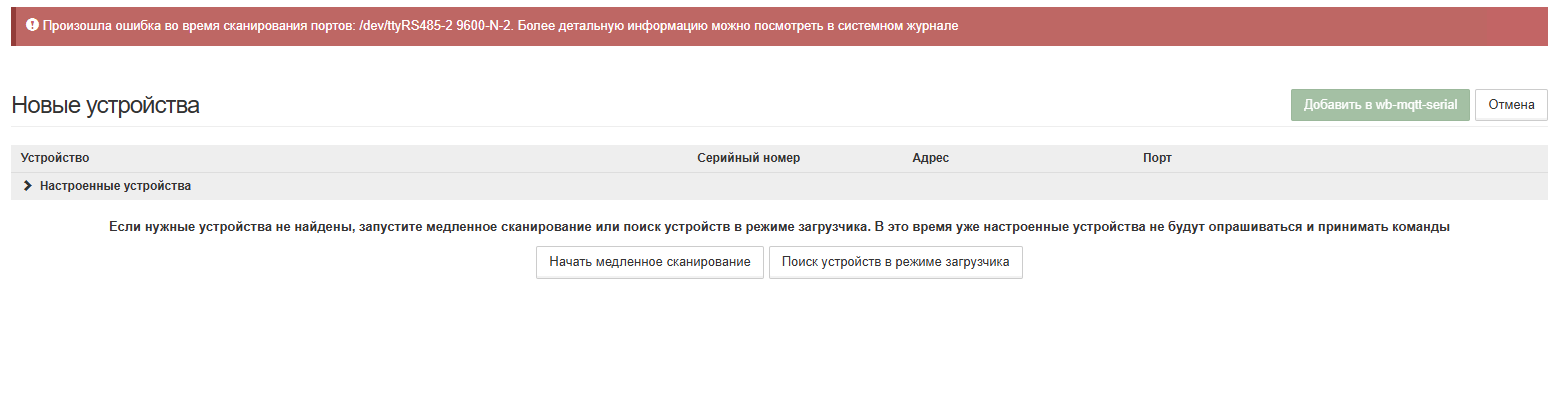 Произошла ошибка во время сканирования портов: /dev/ttyRS485-2 9600-N-2. Более детальную информацию можно посмотреть в системном журнале.