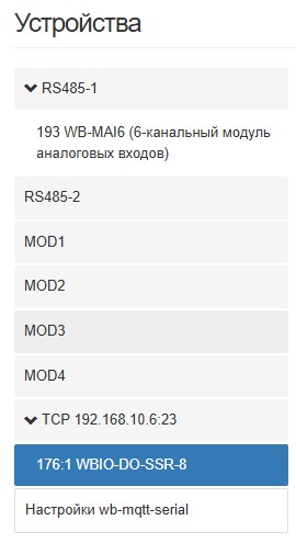 У меня к контроллеру подключено всего 5 устройств: пристыковано 3 модуля в боковой порт и 2 устройства на шине: WB-MAI6 и WBIO-DO-SSR-8 (через WB-MIO-E v.2)
