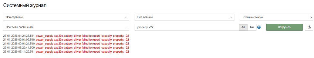 01-04-2025 10:54:47.047 power_supply axp20x-battery: driver failed to report capacity' property: -22 01-04-2025 08:45:40.047 power_supply axp20x-battery: driver failed to report capacity’ property: -22