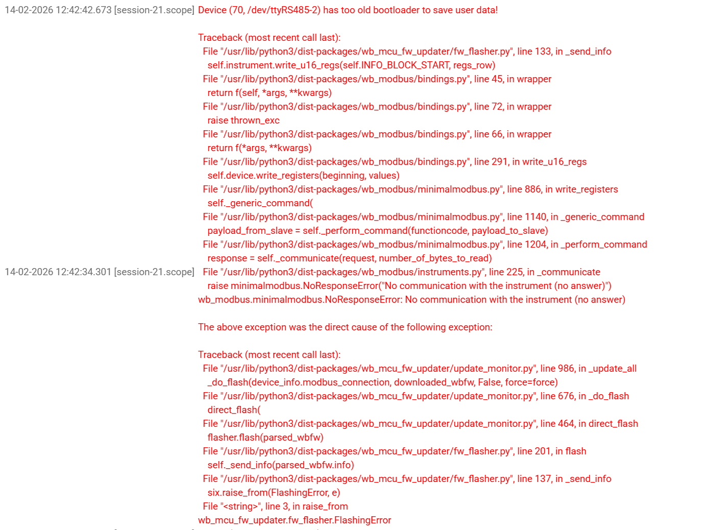 Device (70, /dev/ttyRS485-2) has too old bootloader to save user data!wb_modbus.minimalmodbus.NoResponseError: No communication with the instrument (no answer) и далее FlashingError.Сообщение про “too old bootloader to save user data”