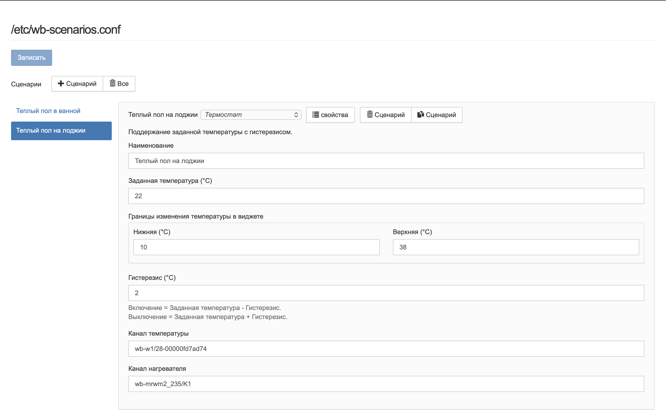 И так несколько раз. Пару дней назад подогрев работал стабильно. В чем может быть проблема? Ранее использовал правило, пример которого нашел на GitHub по ссылкам то ли из wiki wirenboard, то ли на форуме. После обновления контроллера и появления сценариев перешел на сценарии. Когда использовал правило, проблем не возникало. Ошибку