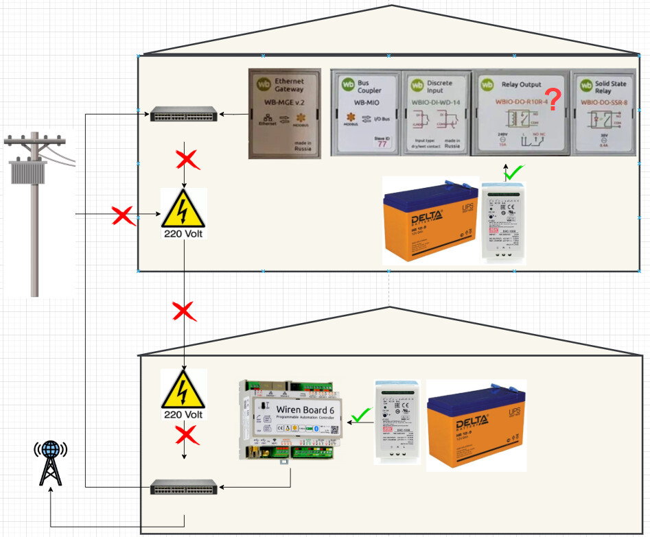Вот примерная схема подключения модулей к контроллеру. При отключении 220 - свитчи отключаются (они без ИБП в данный момент), а контроллер и удаленные модули не отключаются, т.к. работают через ИБП (Meanwell).