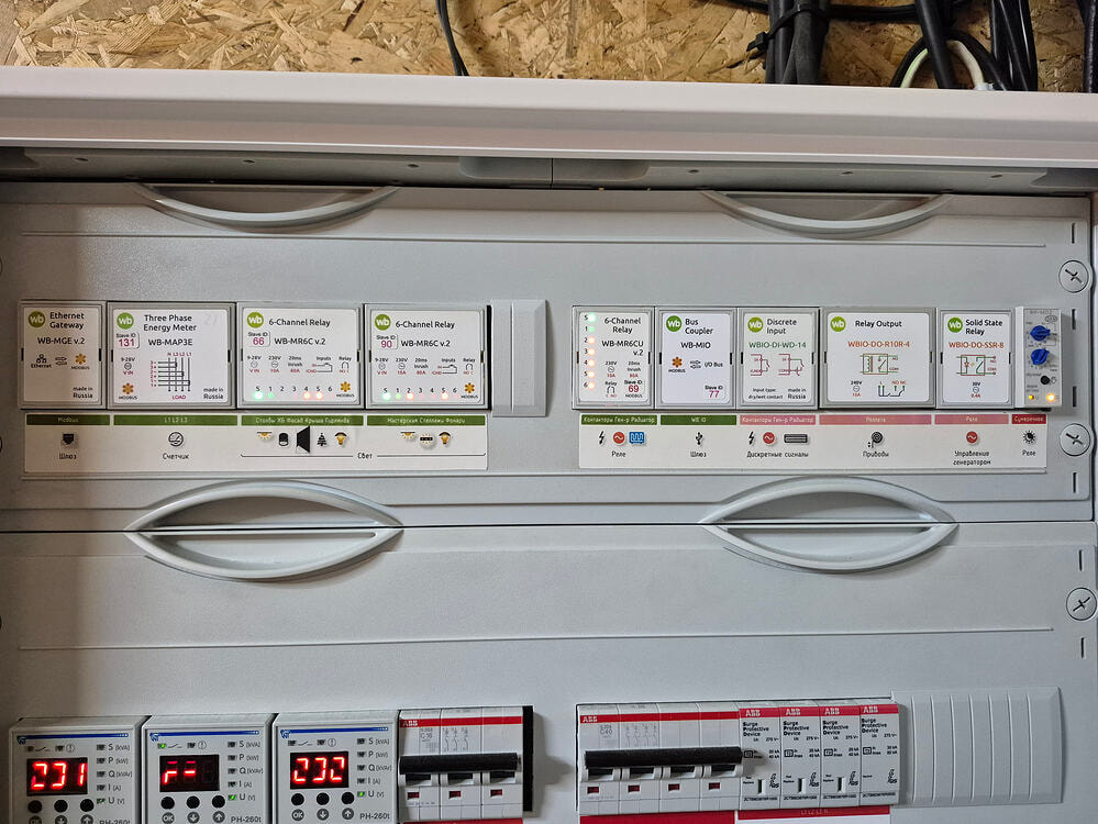 Подключаем WB-MGE к контроллеру, а от него по RS-485 WB-MIO —>WBIO-DI-WD-14 —> WBIO-DO-R10R-4