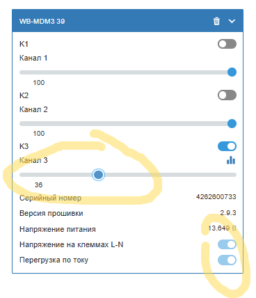 Активация переключателя “Перегрузка по току” см .фото. Светильники соответственно на малом % светит, а после 20-25% начинает мигать(гаснуть при срабатывании “перегруза” и промигивать при восстановлении)