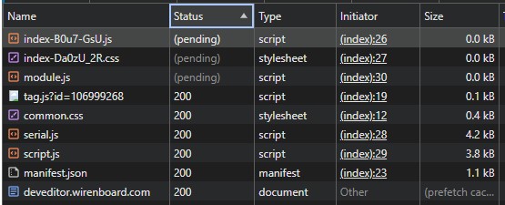 Как уже отмечали здесь, сделали прекрасный веб-конфигуратор для устройств Wiren Board. Но я из дома не могу им воспользоваться без ВПН. Убил целый вечер пытаясь разобраться почему не полностью загружается страница с https://deveditor.wirenboard.com/ (52.19.109.145). Оказалось что в Ростелеке Новосибирск этот ip/сеть Амазон в Дублине (судя по whois) блокируют. Точнее замедляют. Проявляется как неполная загрузка двух файлов index-B0u7-GsU.js (размер файла 645134 байт) и module.js (размер файла 113046 байт), см скрин из devtools браузера Хром. Через около 8 минут отваливается по таймауту.