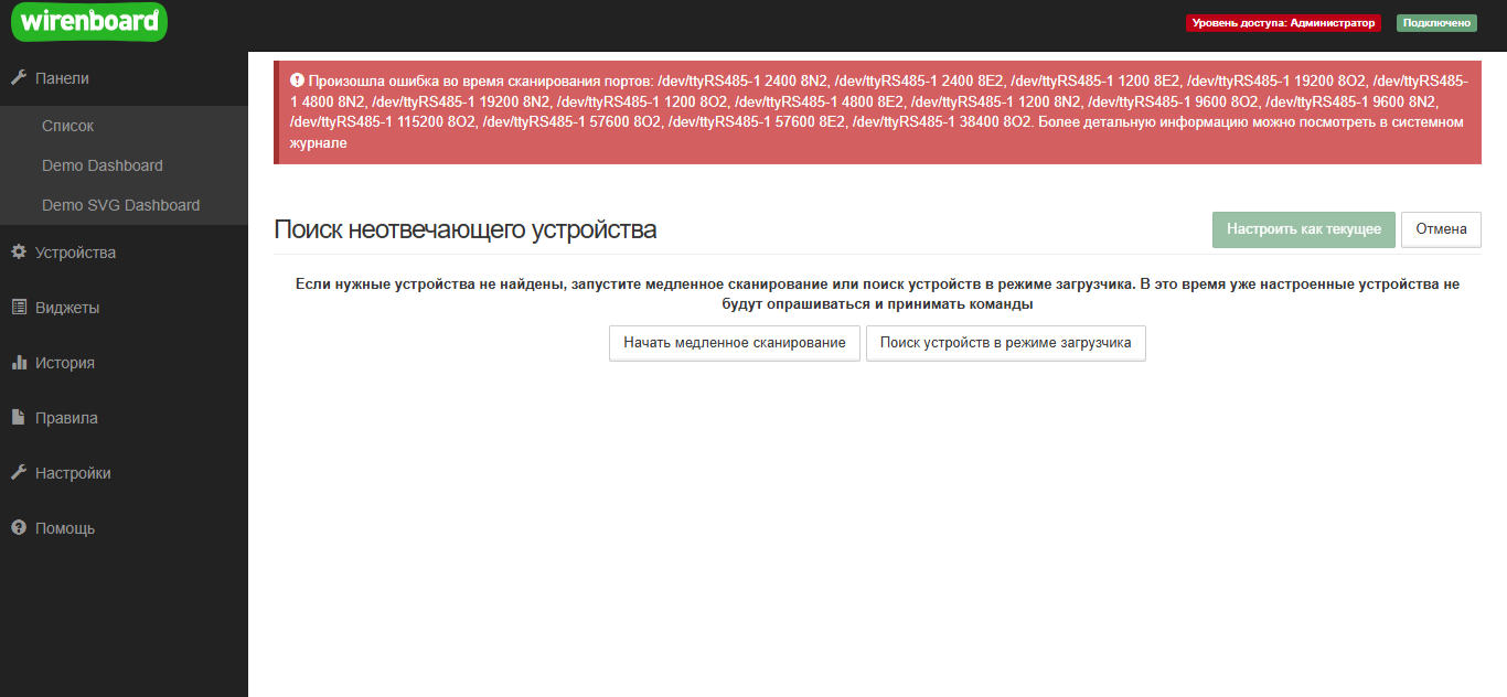 Ещё вчера первый RS-485 работал и показывал соединение с WB-MR6C v.2, а сегодня прихожу и все переменные MR6C горят красным, а при поиске устройства выдаёт ошибку и за подробностями просит заглянуть в журнал.