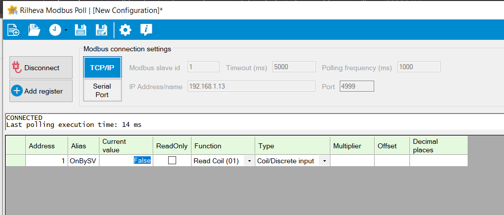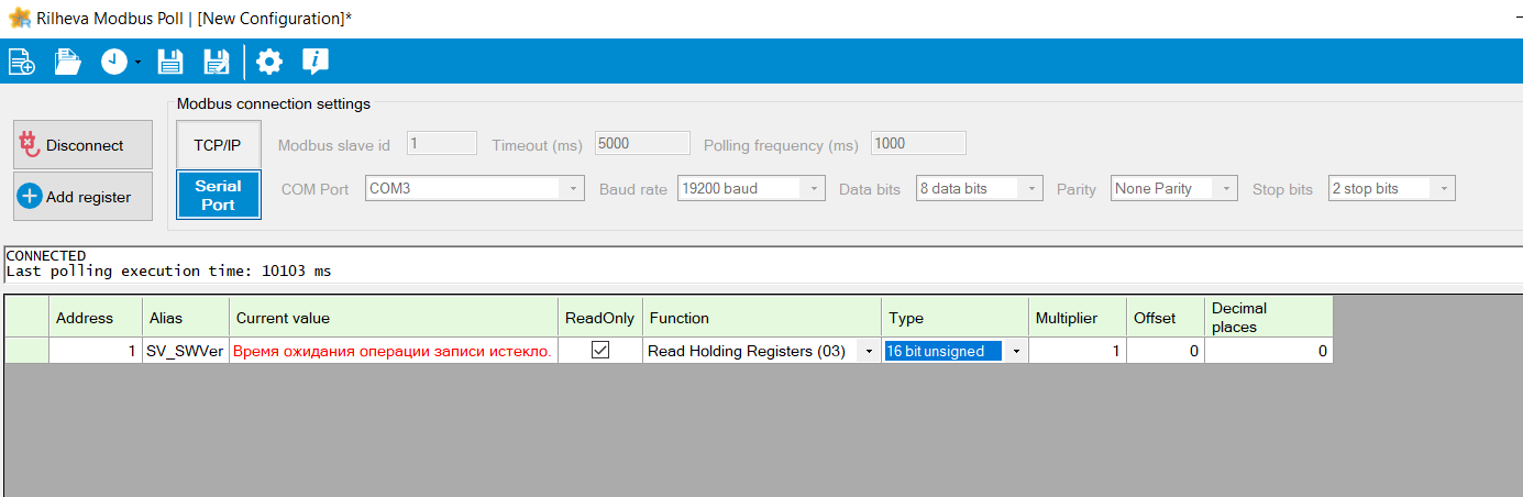 На всякий случай попробовал в Rilheva выставить для переменной и Read Holding Registers и Read Input Registers. Результат одинаковый.