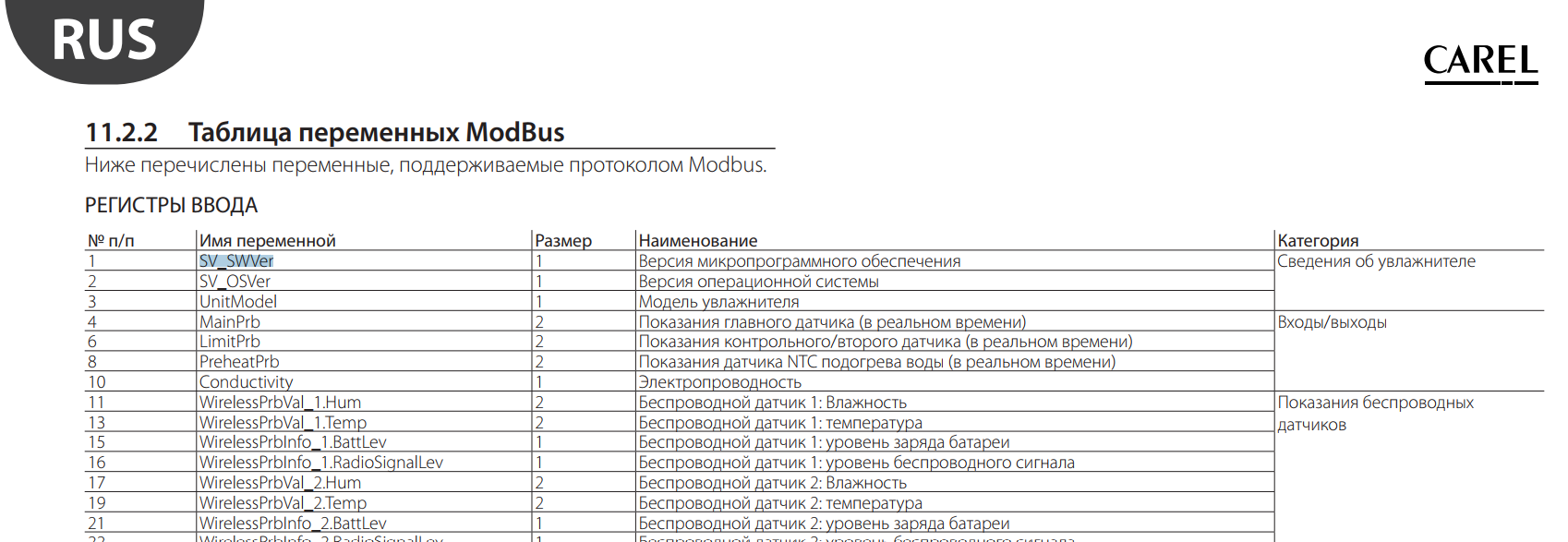 Добрый день. Я использую модбас шлюз WB-MGE v.2 для интеграции увлажнителя Carel.