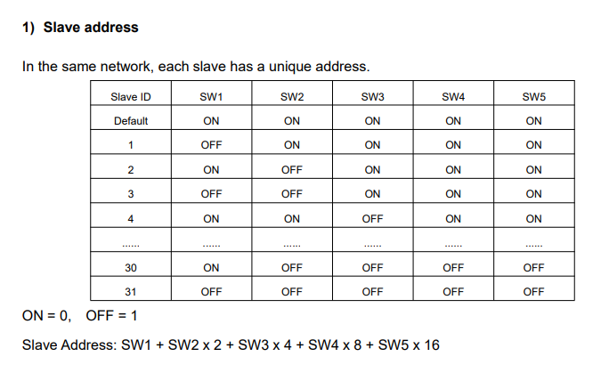 Да конечно, вот смотрите для того что бы у вашего устройства был адрес например 1, то нужно что бы переключатели SW2-SW5 были в положении ON кроме первого.