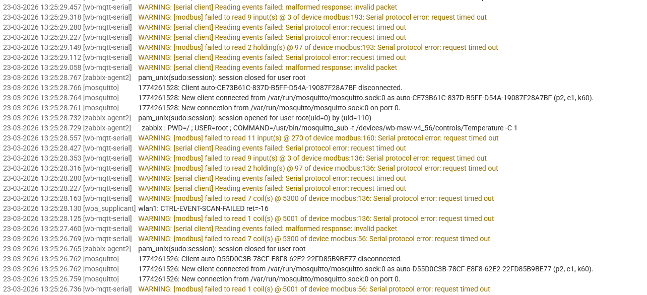 2026-03-23 11:53:12,376 WB-MSW v.4 (56, /dev/ttyRS485-2); WB-MSW v.4 (160, /dev/ttyRS485-2); WB-MSW v.4 (193, /dev/ttyRS485-2)