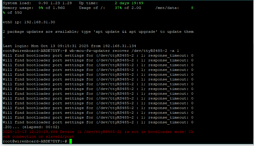 root@wirenboard-ABDE7DYF:~# wb-mcu-fw-updater recover /dev/ttyRS485-2 -a 40