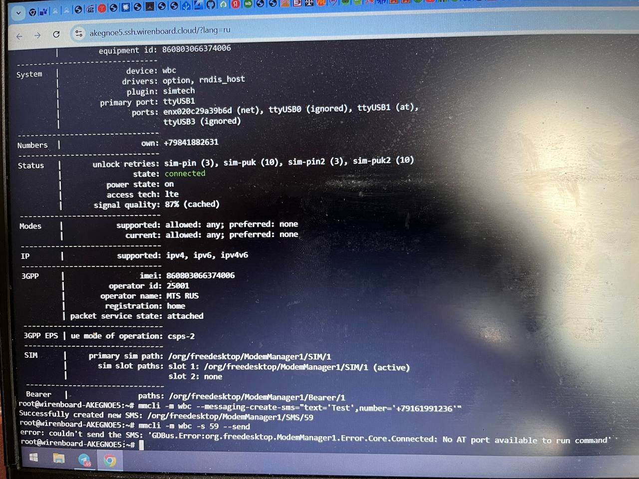 error: couldn't send the SMS: 'GDBus.Error:org.freedesktop.ModemManager1.Error.Core.Connected: No AT port available to run command'