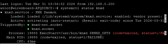 Добрый день. Столкнулся с проблемой запуска сервиса knxd. Видел уже аналогичные топики, но решить вопрос не смог. Перечитал все похожие темы, пробовал разные варинаты как запустить сервис. Подключаюсь патч-кордом. Первый раз как-то получилось запустить все сервисы и работать с Wirenboard через ETS. После сброса устройства сервис перестал запускаться. Удалось запустить knxd только с отключенной галочкой -S в настройках. Подскажите, как всё-таки запустить полноценную работу с Wirenboard в качестве шлюза KNX?