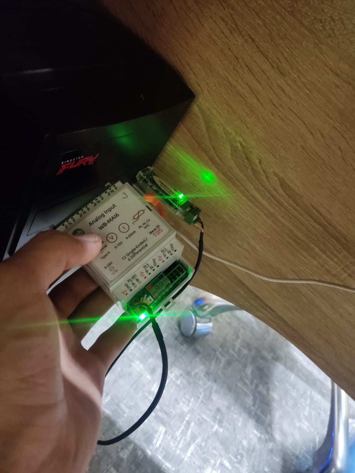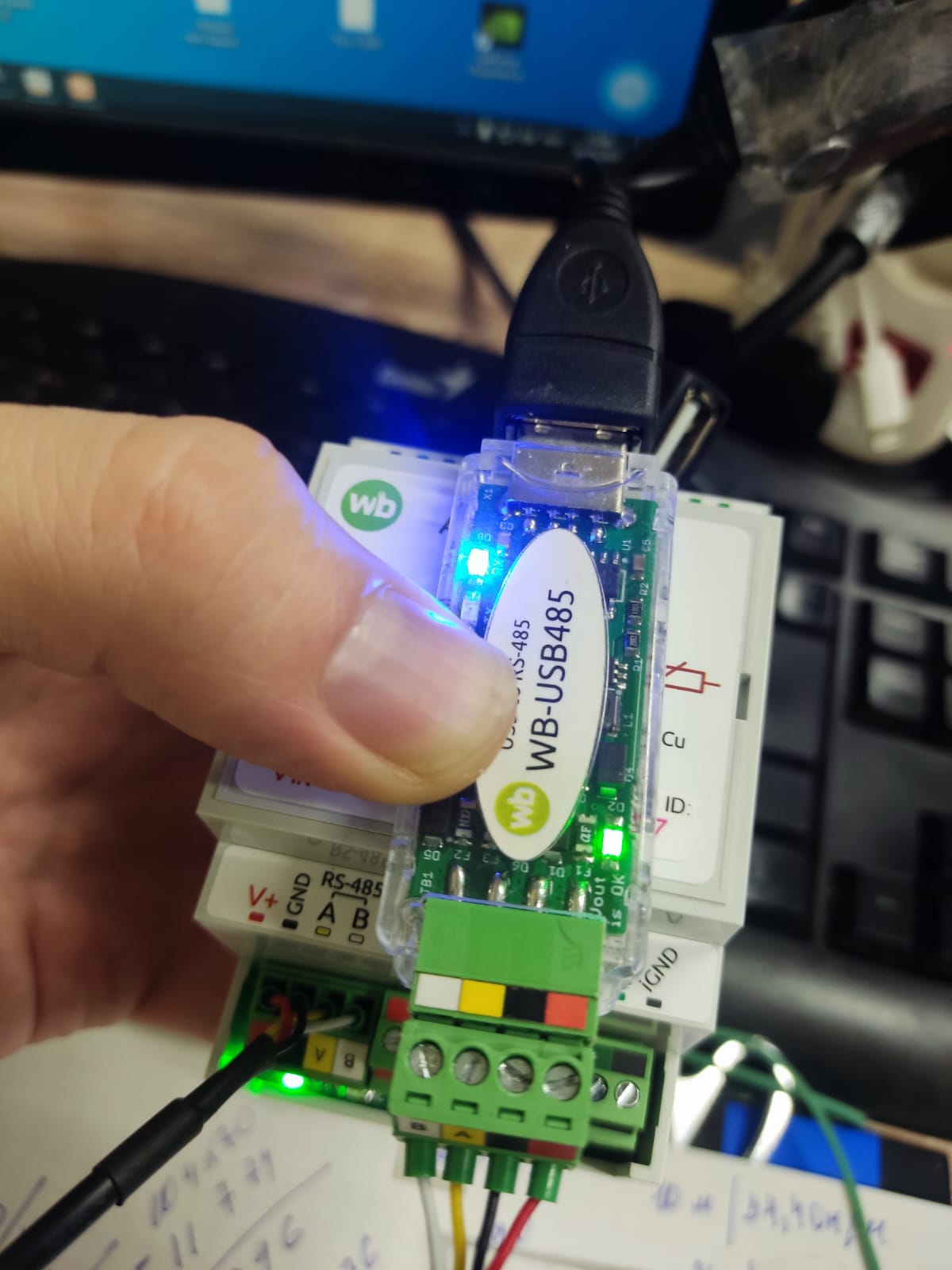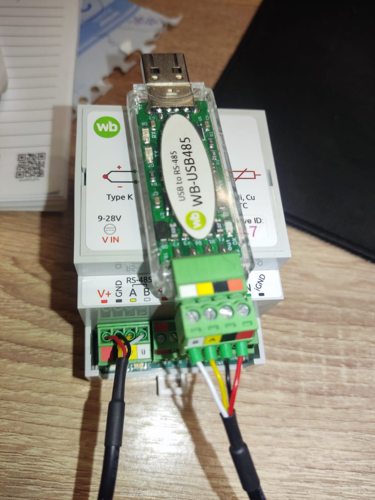 Добрый день. У нас возникла, проблема с модулем mai6. Подключиться к нему нет возможности. При подключении к ПК для конфигурации посредством WB-USB485, горит синий индикатор RX. Зеленый индикатор питания mai6, горит постоянно без опроса, при попытке опростить, мигает штатно.