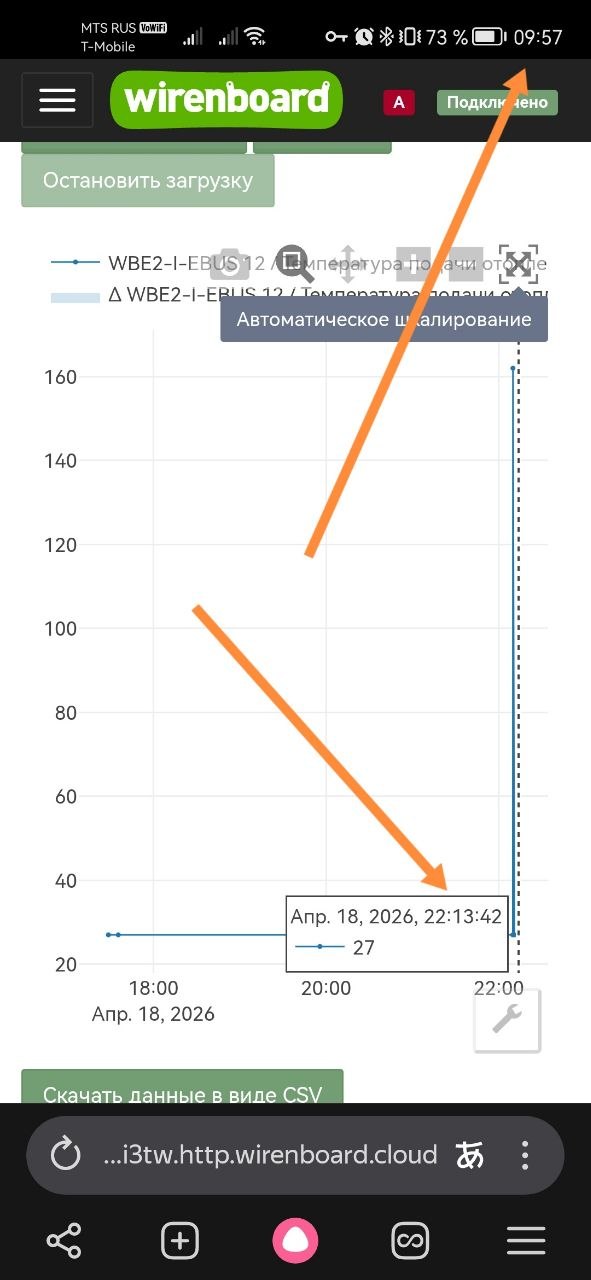 Симптом: примерно через 2 часа после запуска графики и значения в веб-интерфейсе перестают обновляться, но управление уставкой с Wiren Board продолжает работать, ошибок связи по каналу в виджете нет.