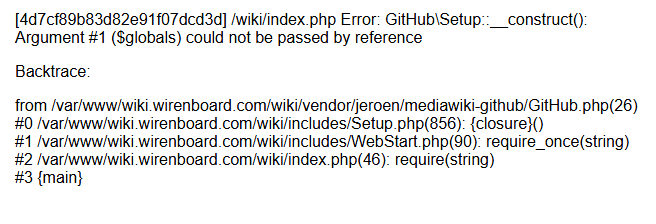 На изображении представлено сообщение об ошибке в PHP, связанное с передачей аргумента по ссылке в конструкторе класса GitHubetup в MediaWiki. (Captioned by AI)