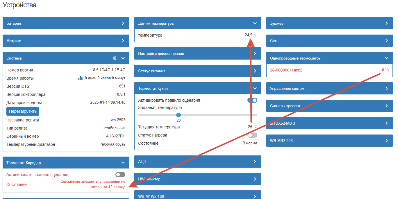 После перезагрузки системы термостат не работает, пишет “Связанные контролы не готовы за 10с”